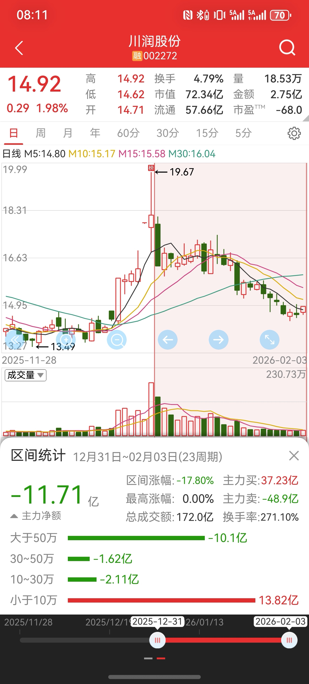 $川润股份(SZ002272)$ 可否理解为:26年1月1日-2月3日,主力疯狂洗盘,小散户成功接盘。请问主力洗完了吗?能不能进场啊?