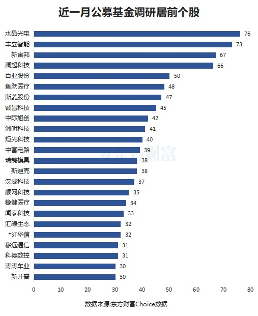 具体看个股,水晶光电为近一月公募基金调研最多个股,来访接待量为76。丰立智能紧随其后,来访接待量为73。新宙邦位于第三位,来访接待量为67。澜起科技、百亚股份、鱼跃医疗等也被公募基金调研居前。