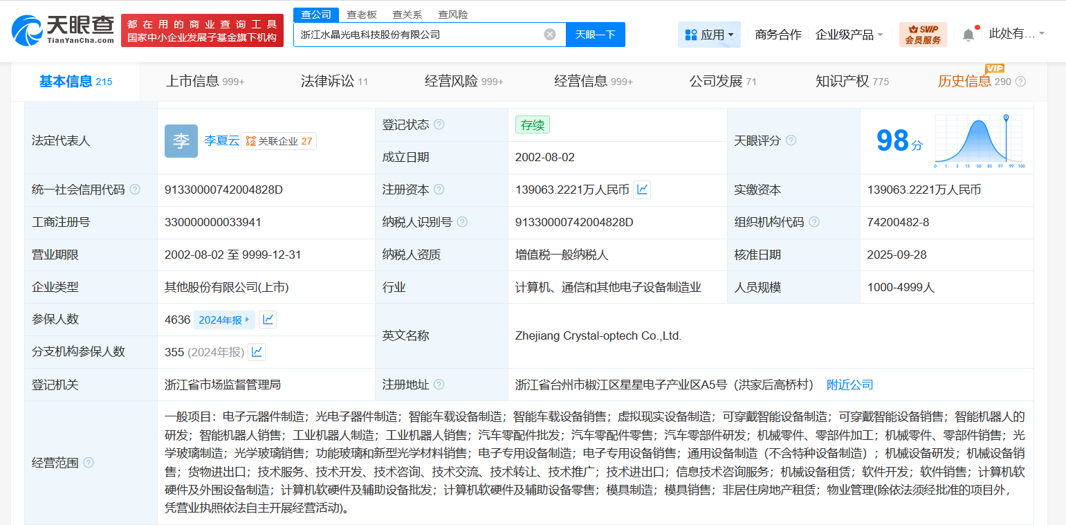 南方财经10月10日电,天眼查工商信息显示,近日,水晶光电(002273)发生工商变更,林敏卸任法定代表人、董事长,由李夏云接任,同时,多位主要人员均发生变更。浙江水晶光电科技股份有限公司成立于2002年8月,注册资本约13.9亿人民币,经营范围含电子元器件制造、光电子器件制造、智能车载设备制造、智能车载设备销售、虚拟现实设备制造、可穿戴智能设备制造、智能机器人的研发、智能机器人销售等。股东信息显示,该公司由星星集团有限公司、杭州深改哲新企业管理合伙企业(有限合伙)、香港中央结算有限公司等共同持股。据媒体报道,今年8月,水晶光电召开线上投资者交流会,公司新一届核心领导层正式亮相,此次调整涉及董事会及高管团队优化。创始人林敏卸任董事长,转任董事及董事会战略与可持续发展委员会主任委员,李夏云接任董事长。