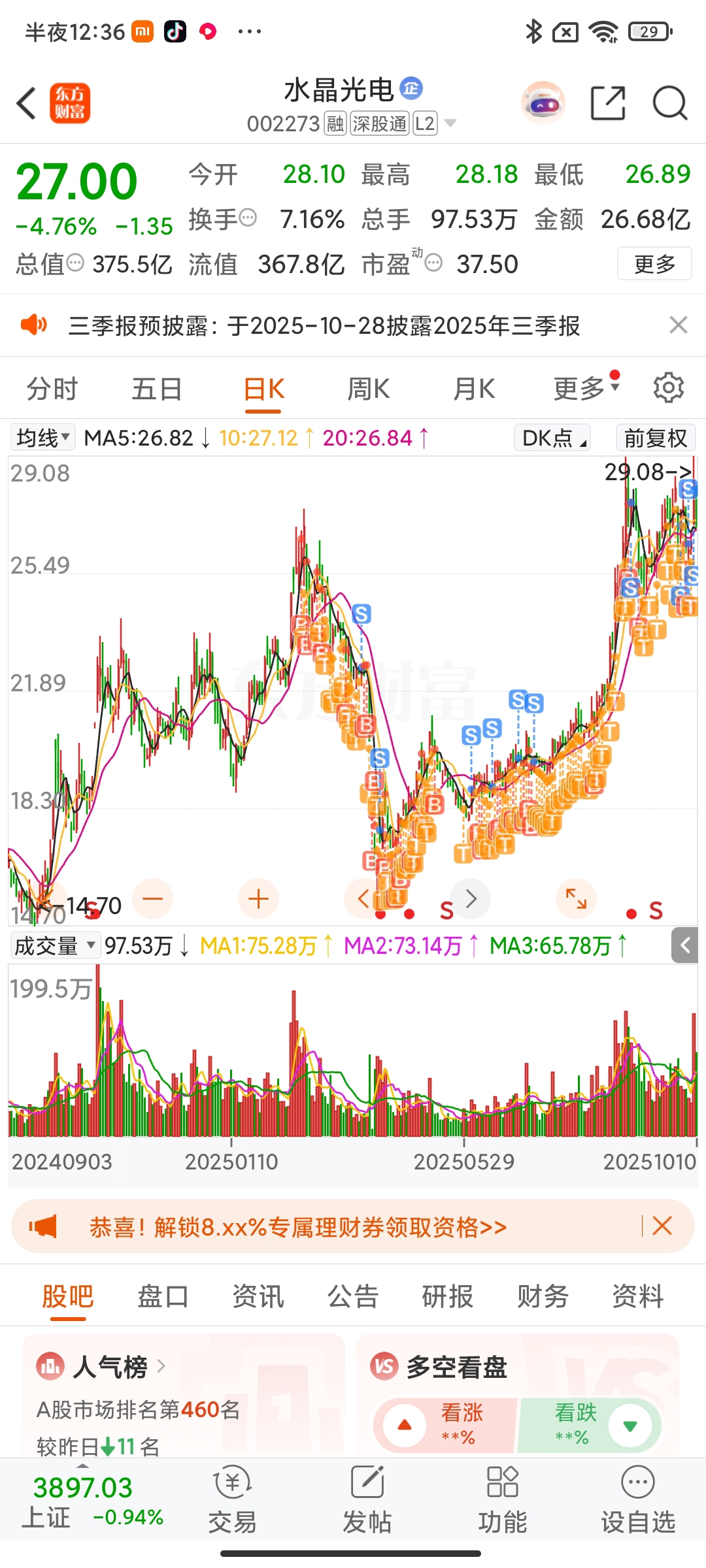 $水晶光电(SZ002273)$ 水晶的多空对手盘很厉害。单拿捏散户最大的三个优势。打败对手盘。那就是时间,耐心的心态,和厌其烦的复盘纠正交易模式。直到摸清股性。大胆高抛低吸。