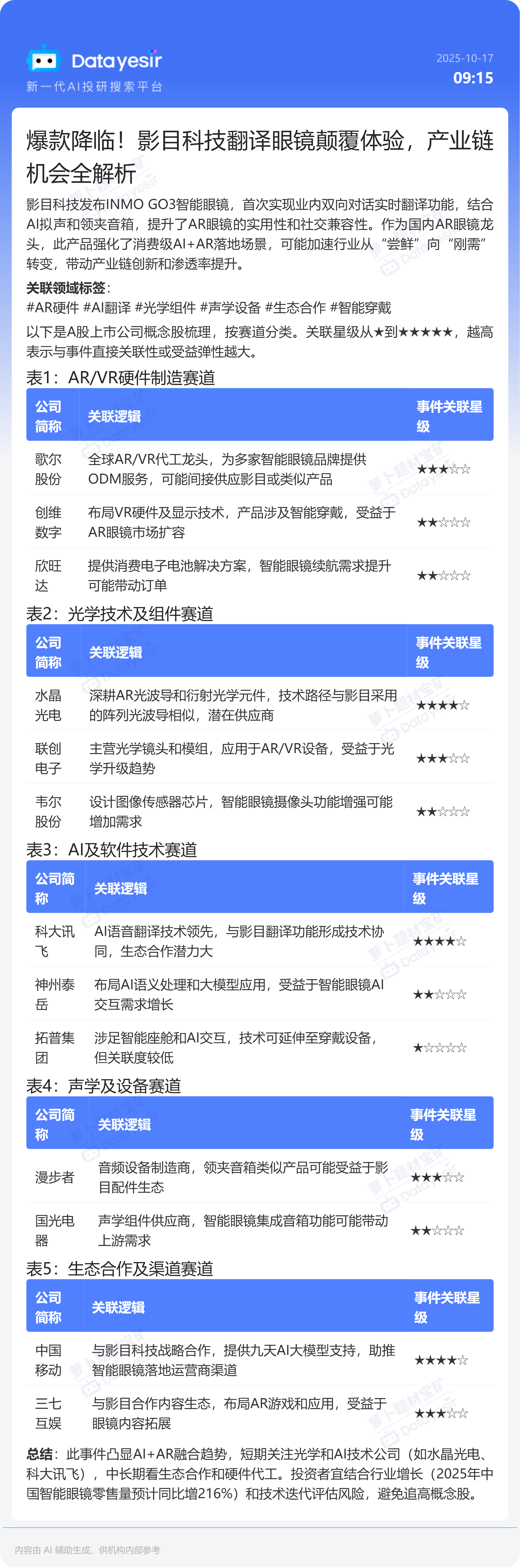 影目科技发布INMO GO3智能眼镜,首次实现业内双向对话实时翻译功能,结合AI拟声和领夹音箱,提升了AR眼镜的实用性和社交兼容性,此产品强化了消费级AI+AR落地场景。