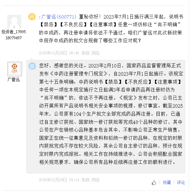 “截至2025年末,公司原有的104个生产批文已全部完成药品再注册,核心产品龟龄集的说明书也已修订获批,明确表示不存在因新规退市的风险。”广誉远也在互动平台回答投资者提问时表示。