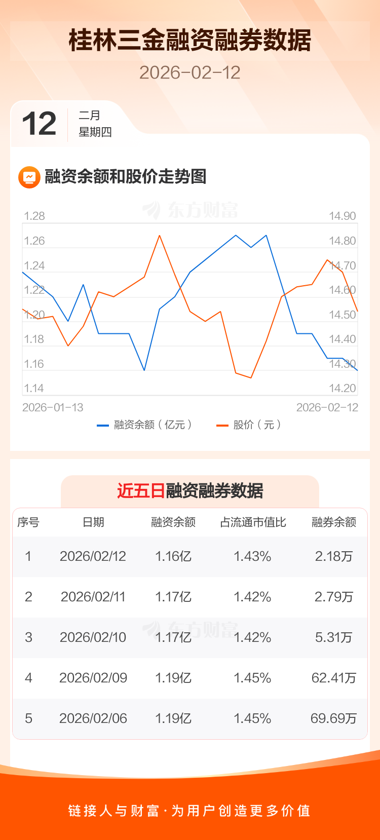 交易所最新数据显示,桂林三金于2026年2月12日获融资买入304.94万元,融资偿还385.21万元,当日融资净偿还80.27万元。目前,该股融资余额1.16亿,占流通市值比例为1.43%。