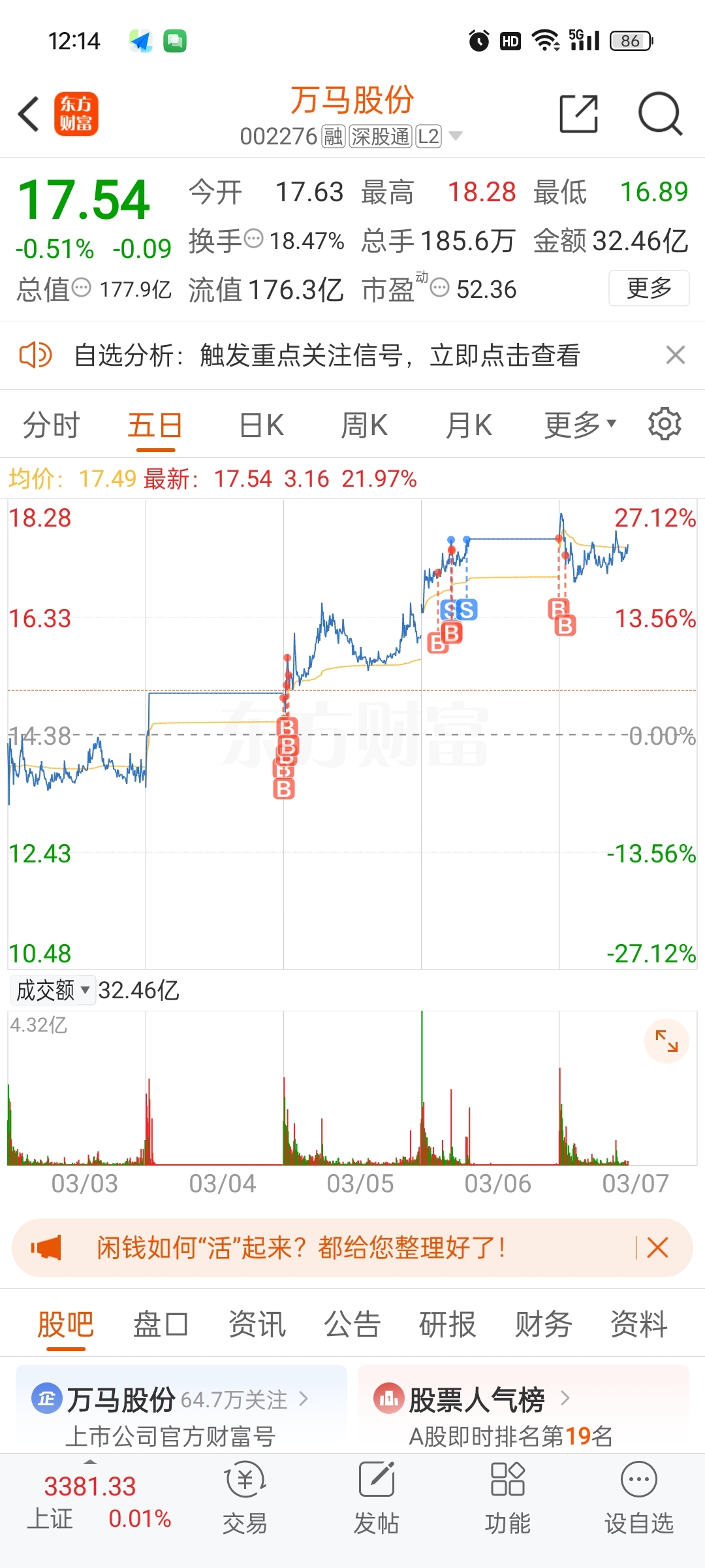 $万马股份(SZ002276)$ 万马股份,今天进急了点,主要还是太看好了,今天预计两种走势,一是收盘十字星,差不多就是上午收盘这种。二是下午拉涨停。我个人感觉一种的概率大一点点。如果是第一种走势,那下周一可能就平开拉涨停。所以今天我的策略还是持股待涨,最多下午找机会把今天买入的那部分t出去。