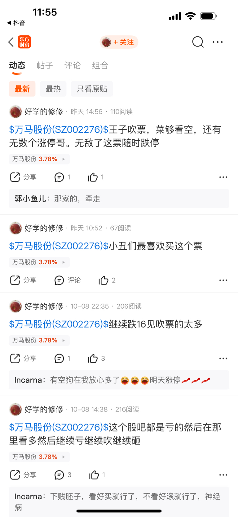$万马股份(SZ002276)$ 这人好像有点脑子不正常,你问他的时候他说满仓万马赚麻了,但是又攻击任何唱多的人