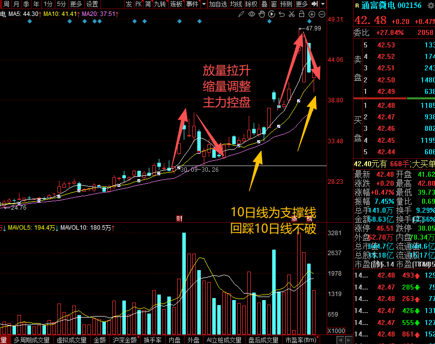 整体股价趋势向上,量价结构完美,近期缩量调整,主俚在洗盘,今天收出一个单针探底的阳线,股价收回在10日线上方,目前很明显10日线就是它的支撑线,主俚控盘的非常稳,股价正在沿着10日线震荡走高,10日线可以作为我们的买点,如果今天股价在开盘后的半个小时能稳定在10日线上方,并且成交量出现异动的放量,直接上车,在文章留言区也会通知大家,可以多去看下留言区老张我发的留言。