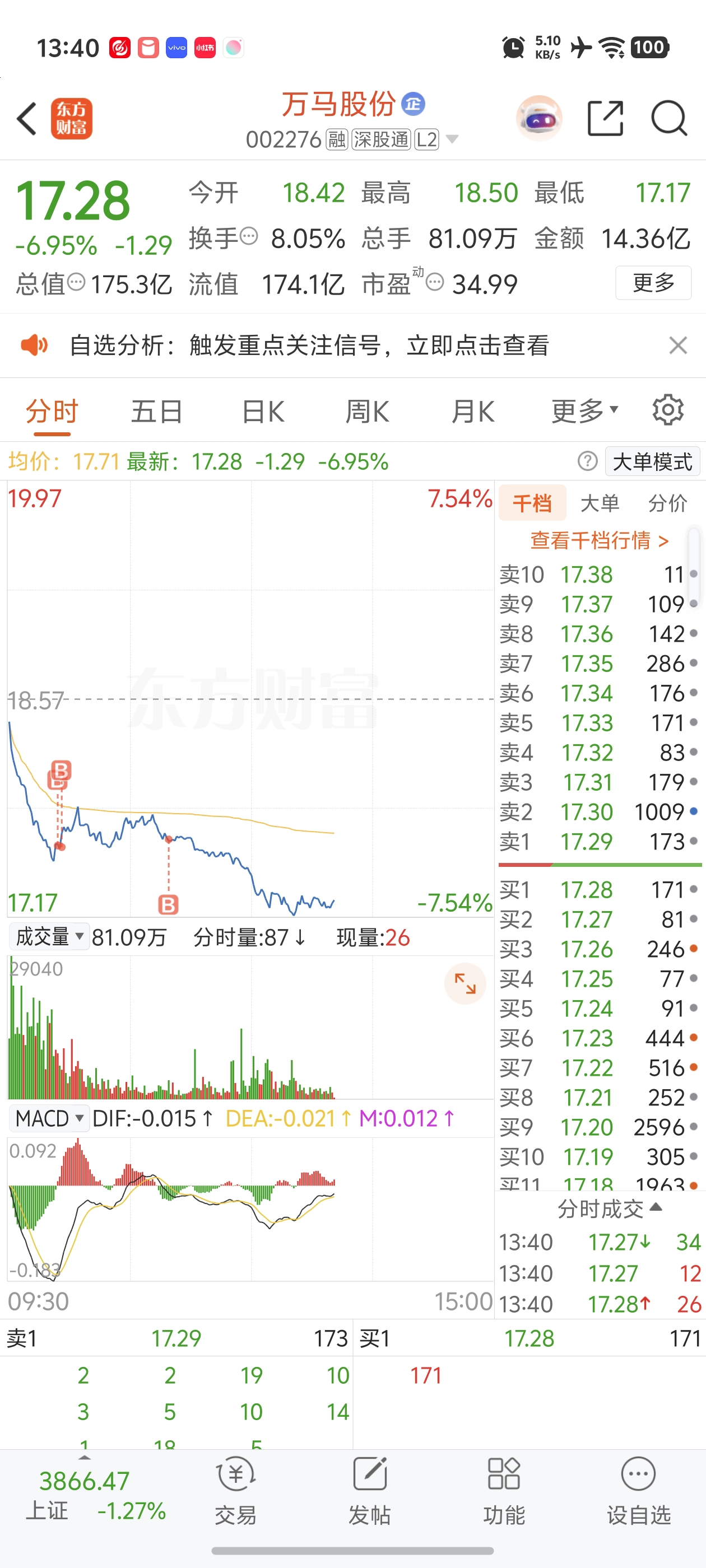 $万马股份(SZ002276)$ 这个票我昨日出的,今天买进,如果再跌继续买,不破不立 这个票最佳时间还未到,当前很明显是有强壮在控盘,红肥绿瘦,主力也不赚钱,这是很金典的走势,这地方就是需要杀一波才能完整起飞,可以参考景兴纸业的走势,要想破前高必须深蹲,而且是必须要缩量下跌清洗着急的这群人!
