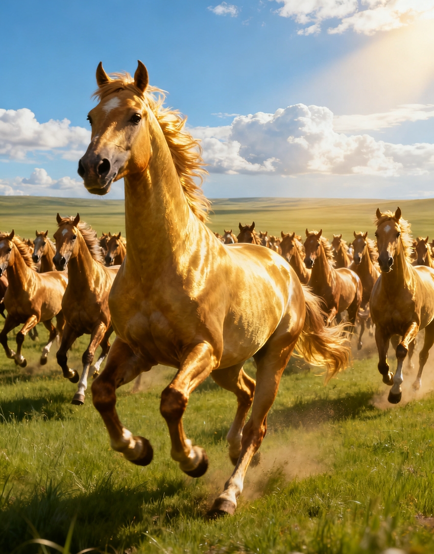 观万马奔腾惊雷滚地破晨霜,万骑嘶风踏野荒。铁蹄翻处尘遮日,赤鬣扬时气贯苍。莫道山