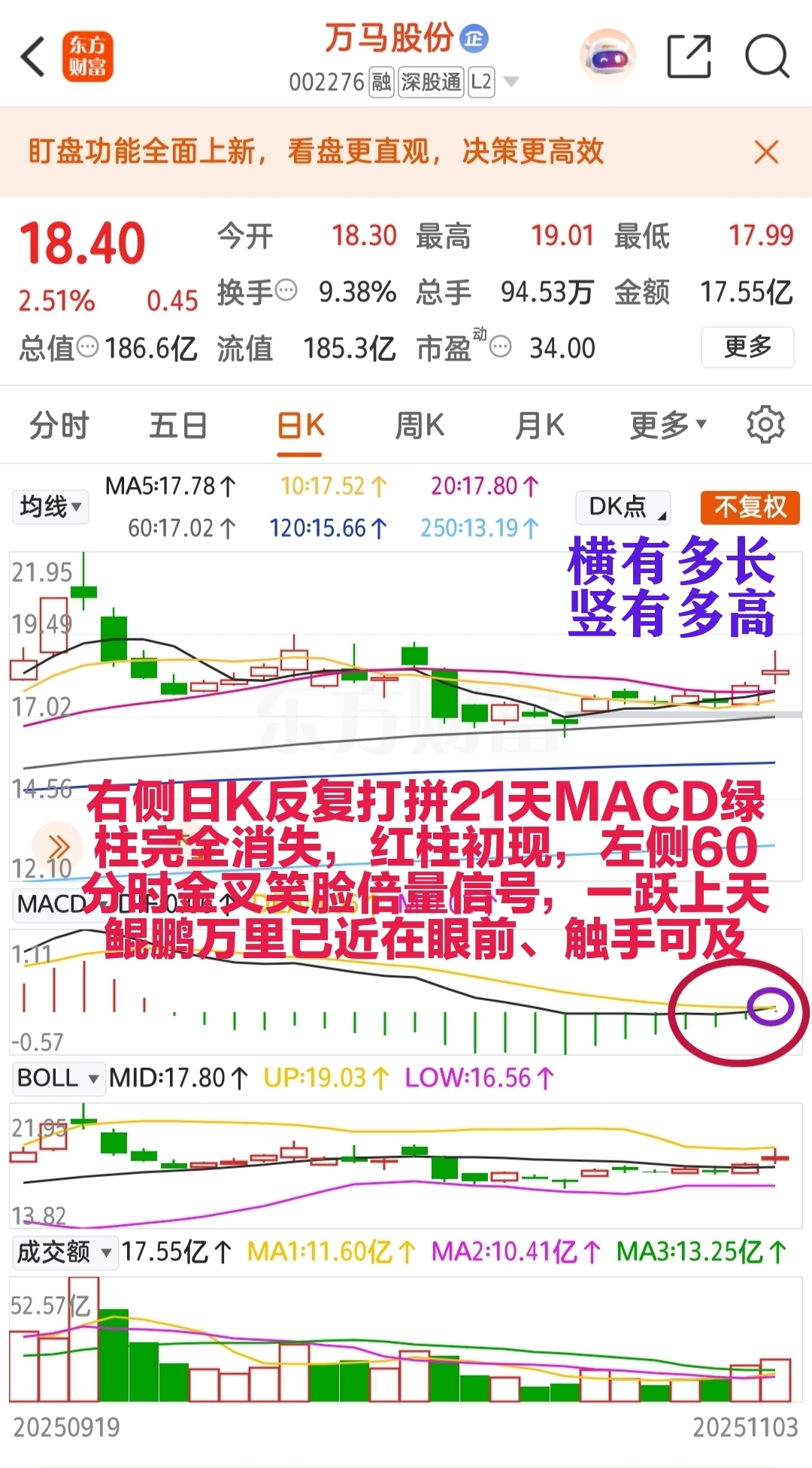 道阻且长,行则将至;行而不辍,未来可期!MACD趋势指标绿柱今天已完全消失,红柱