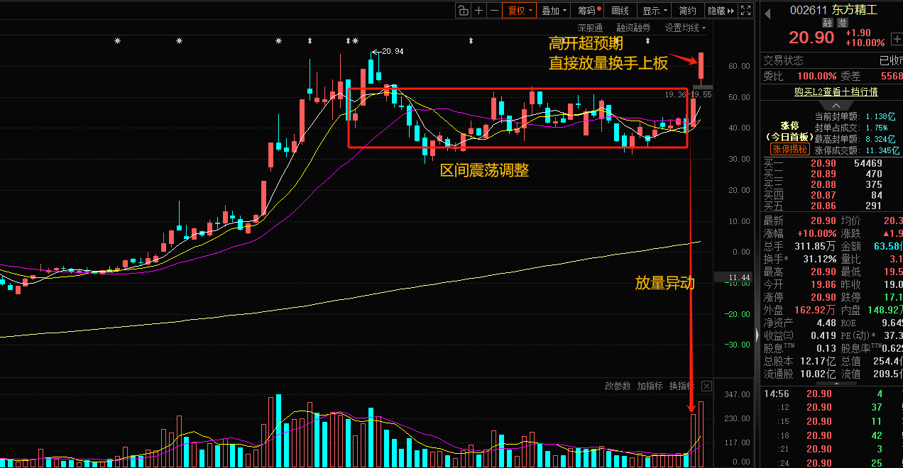 东方精工002611:前面主升之后一直是高位震荡,这里连续两天放量换手,并且昨天还板了,那么短期空间被打开,今天高开的话也许会出现冲高回落,如果继续放量或者上影线不长可以继续看一天,当然,如果板的话就不用管。它是属于机器人概念以及NV方向,公司持有嘉腾机器人21%的股份,嘉腾机器人是国内工业机器人AGV十大品牌商之一,而AGV是柔性生产线和智能仓储物流系统的关键设备之一,具有自动化程度高灵敏、安全等特色,在智能制造生产系统中得到了广泛应用。另外,基于多年的长期合作与智能应用领域的深度共识NVIDIA公司对嘉腾领先推出的生成式A高度认可,并在智能创新项目云集的CES展会对该应用进行了多场景多模态展示。