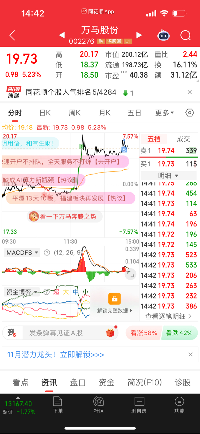 $万马股份(SZ002276)$ 先走为敬20有压力,明天就得下来