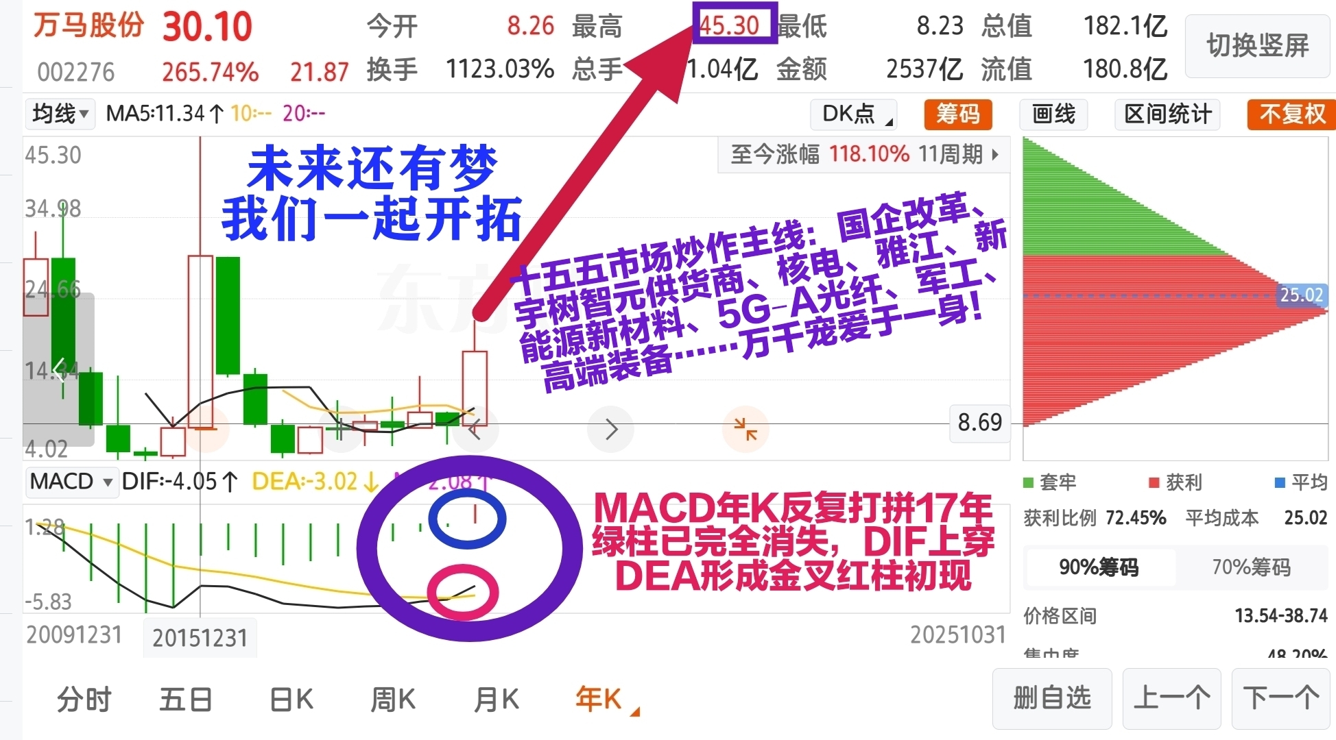 $万马股份(SZ002276)$ 万马股份,MACD、EXPMA、KDJ全部金叉,地量见地价,底背离出现。下午给我飞起来红彤彤收盘,诚邀北路利市仙官姚少司(中国著名顶级游资章盟主、陈小群)入驻万马奔腾,一跃上天鲲鹏万里飞起来!越高越好!