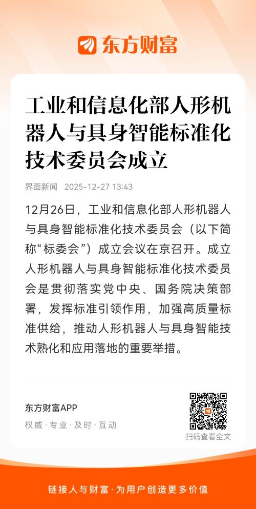 12月26日,工业和信息化部人形机器人与具身智能标准化技术委员会(以下简称“标委会”)成立会议在京召开。工业和信息化部党组成员、副部长柯吉欣,全国政协常委、致公党中央副主席、全国妇联副主席、中国电子学会理事长徐晓兰出席会议并讲话。工业和信息化部总工程师、标委会主任委员谢少锋出席会议。部科技司有关负责同志宣读标委会成立公告。