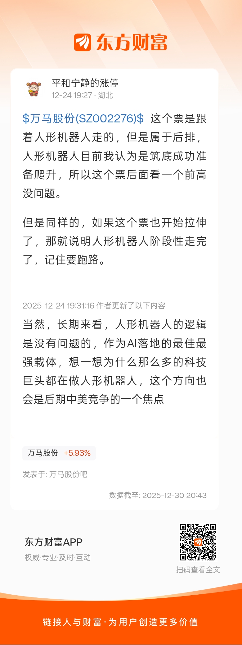 $万马股份(SZ002276)$ 这个票是跟着人形机器人走的,但是属于后排,人形机器人目前我认为是筑底成功准备爬升,所以这个票后面看一个前高没问题。