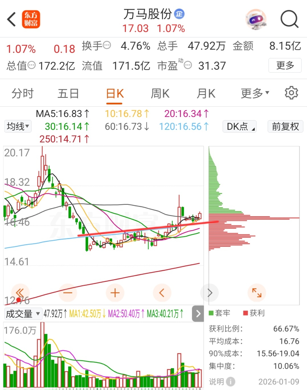现在证券市场有几+万家专业投资机构,信息的传播速度更快,大资金的信息渠道和资金占主导权!判断主力资金的走向才是关键!万马股份主力资金放量突破16.50元的27天整理平台后连续震荡整理7天,在整理一周没有收盘低于16.50元以下的,本属于强势震荡,下周万马股份在利好信息的助力下有望向上攻击18元到20元区域!2026年,万马奔腾!马到成功!