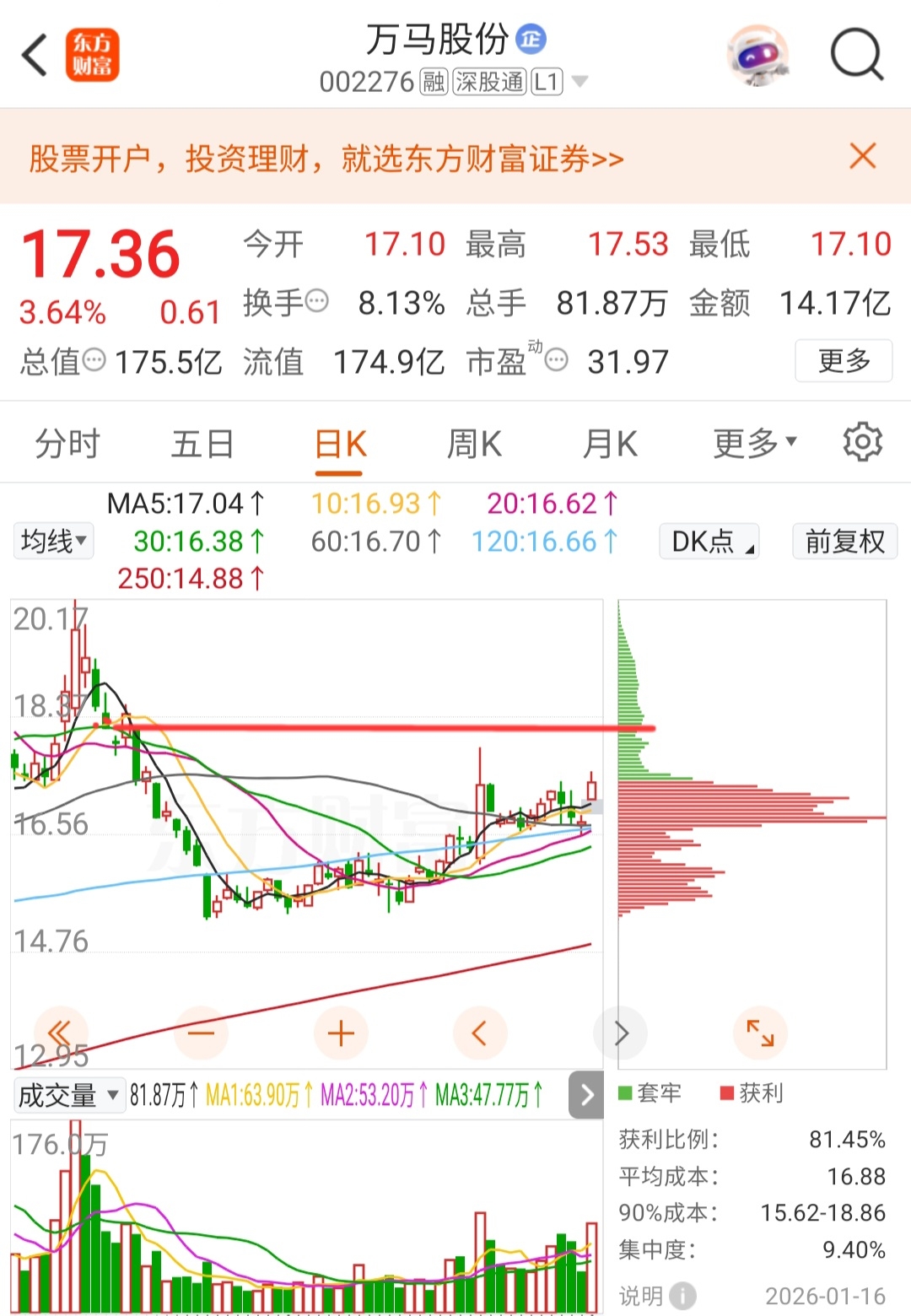 周末马年春晚节目单出笼,特别是人形机器人的表演节目让人耳目一新!周末证监会和央视评论信息的发酵,让科技业绩成长股走向前台!万马股份从趋势向上的成交量来判断,18元以下区域没有成交量堆积,下周轻松过18元没有问题!但如果再上攻到18到20元区域,就需要主力资金连续放量来换手!万马股份中线大趋势就是慢牛!