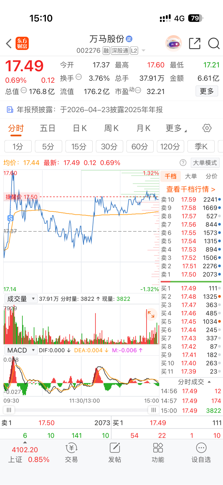 $万马股份(SZ002276)$ 那天16.2买的 目标价17.5卖了,满足了,留下的兄弟发财