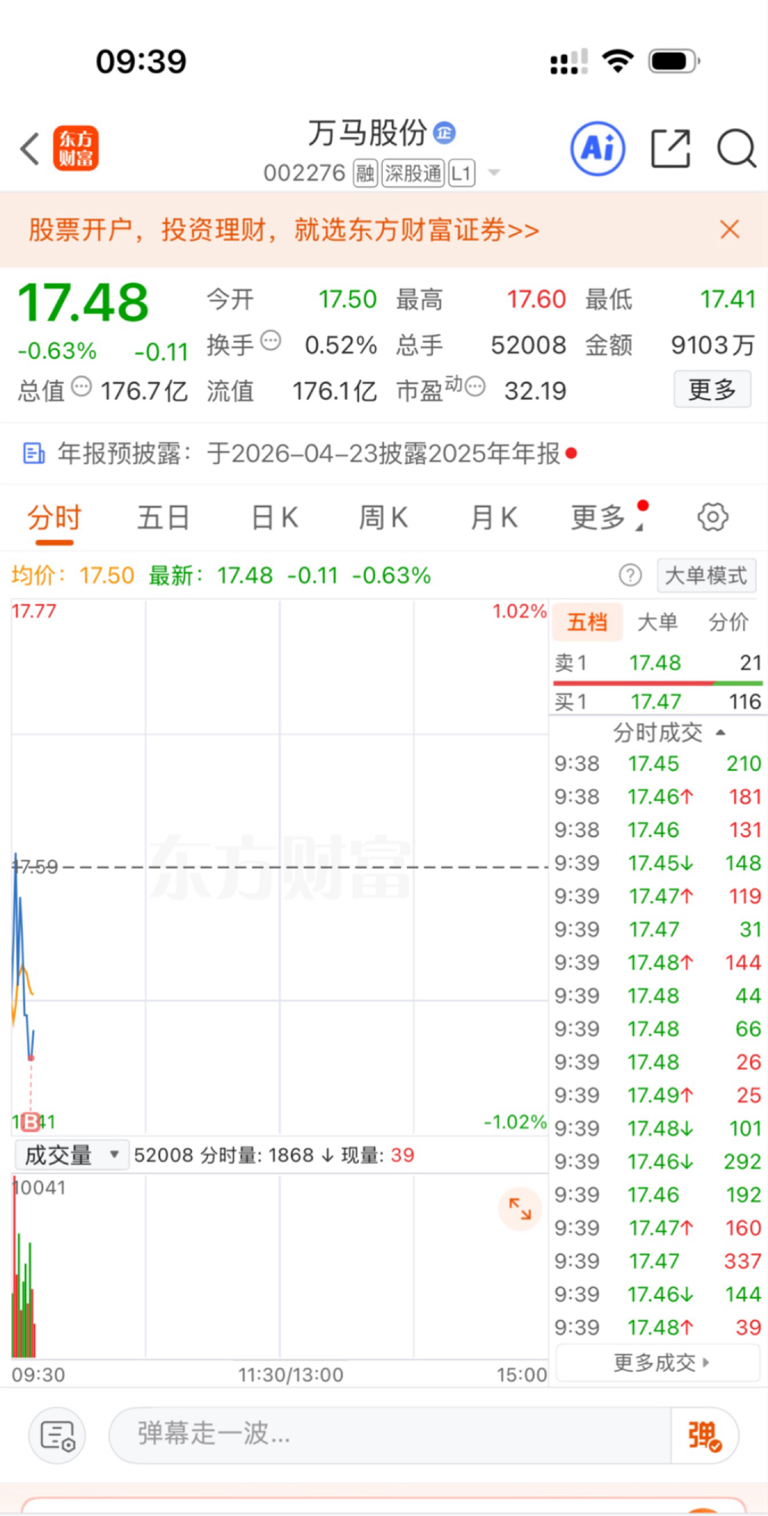 17.46选择水下低吸博弈$万马股份(SZ002276)$ #强势机会# #实盘记录# #投资干货# #投资随笔#