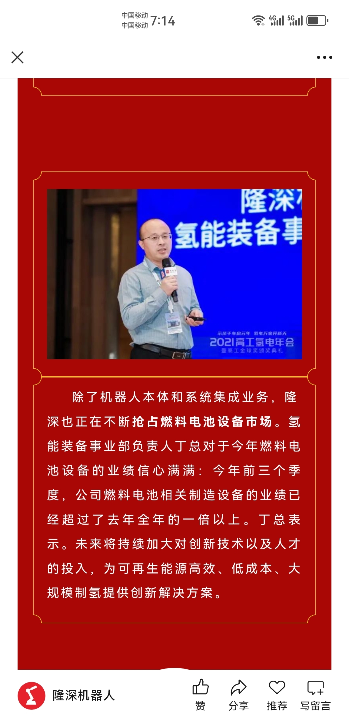 隆深以工业机器人闻名于业界,很多人不知道的是,氢燃料电池设备也是隆深的重要业务板块,其销售额已经占总销售额的三分之一,未来这个比例或许还会更高。