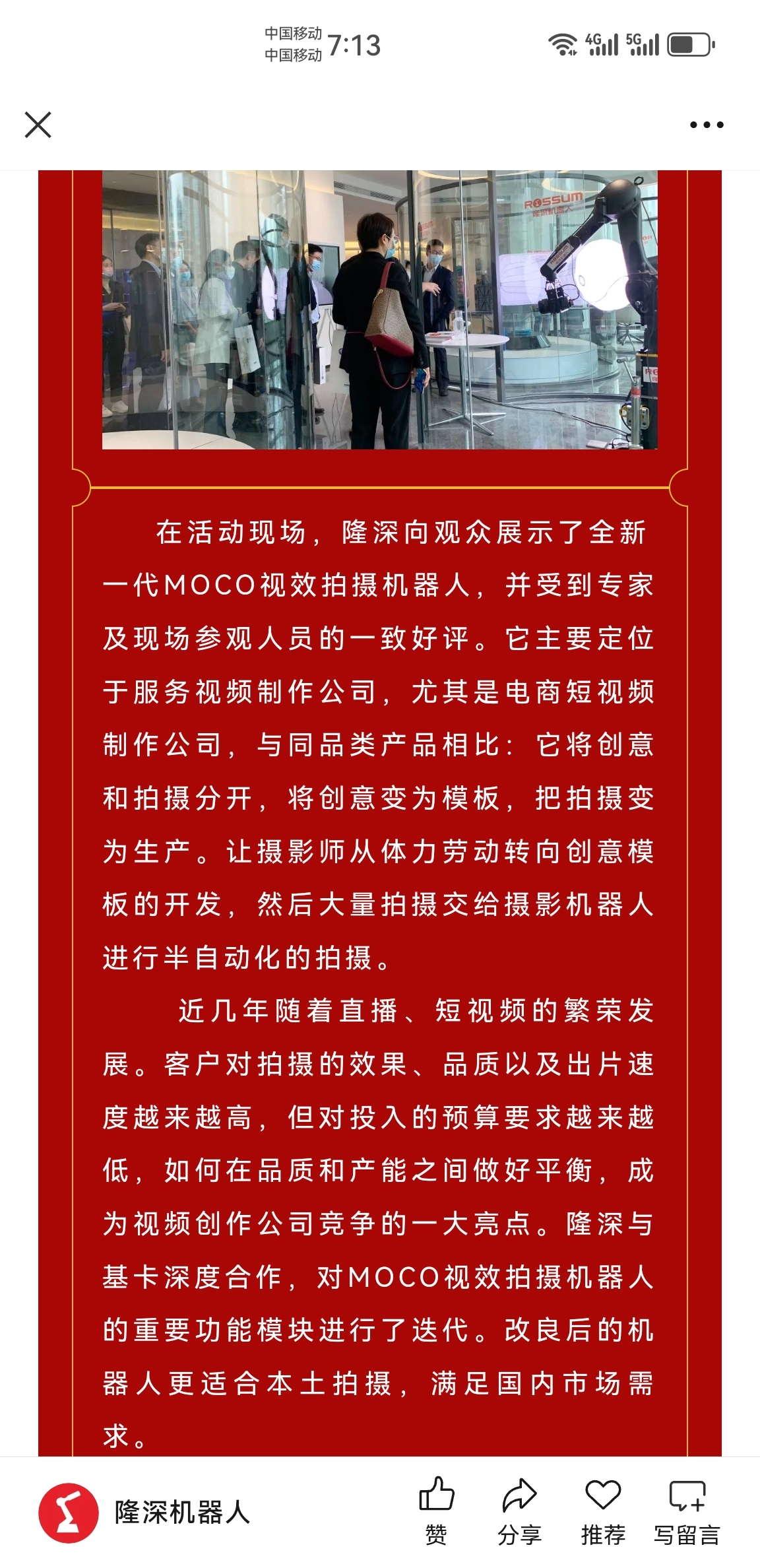 4月3日,隆深机器人发布消息指,佛山隆深集团在3月31日代表佛山市优秀企业参加(广东)人才港展示活动。在活动现场,隆深向观众展示了全新一代MOCO视效拍摄机器人,并受到专家及现场参观人员的一致好评。它主要定位于服务视频制作公司,尤其是电商短视频制作公司,与同品类产品相比:它将创意和拍摄分开,将创意变为模板,把拍摄变为生产。让摄影师从体力劳动转向创意模板的开发,然后大量拍摄交给摄影机器人进行半自动化的拍摄。