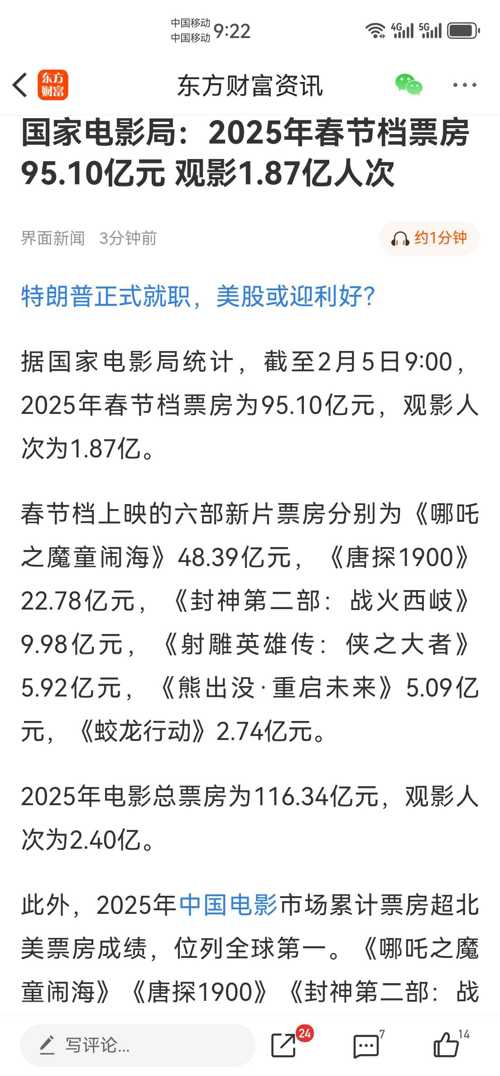 原标题:国家电影局:2025年春节档票房95.10亿元 观影1.87亿人次
