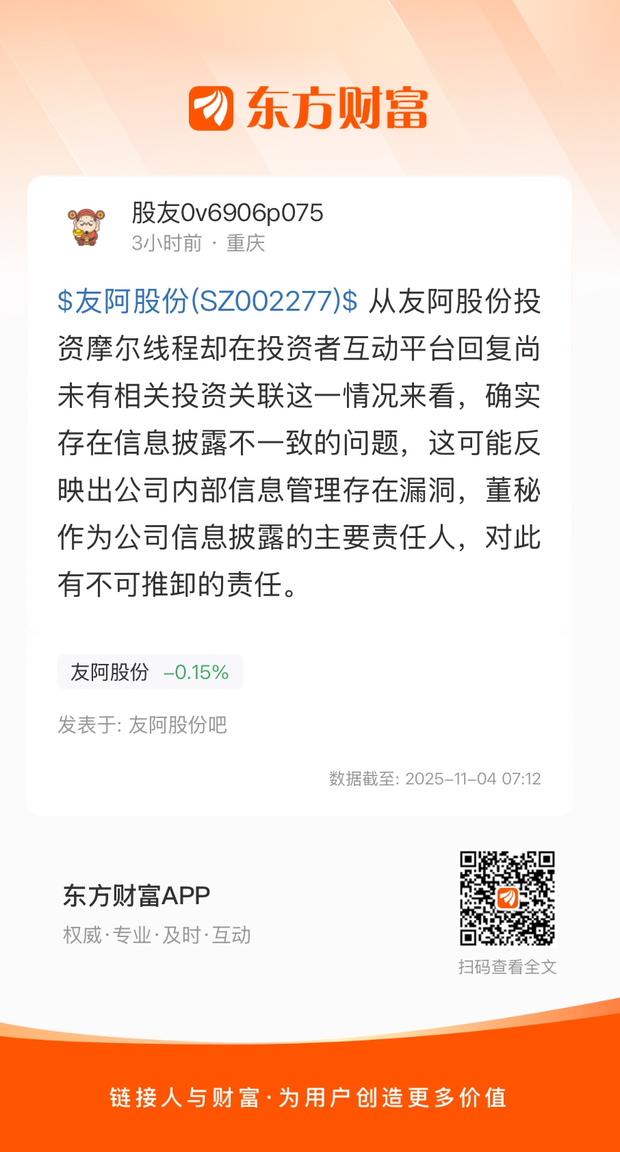 $友阿股份(SZ002277)$ 从友阿股份投资摩尔线程却在投资者互动平台回复尚未有相关投资关联这一情况来看,确实存在信息披露不一致的问题,这可能反映出公司内部信息管理存在漏洞,董秘作为公司信息披露的主要责任人,对此有不可推卸的责任。
