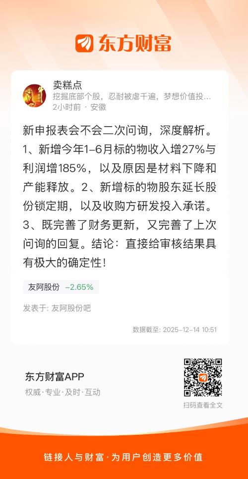 新申报表会不会二次问询,深度解析。1、新增今年1-6月标的物收入增27%与利润增185%,以及原因是材料下降和产能释放。2、新增标的物股东延长股份锁定期,以及收购方研发投入承诺。3、既完善了财务更新,又完善了上次问询的回复。结论:直接给审核结果具有极大的确定性!