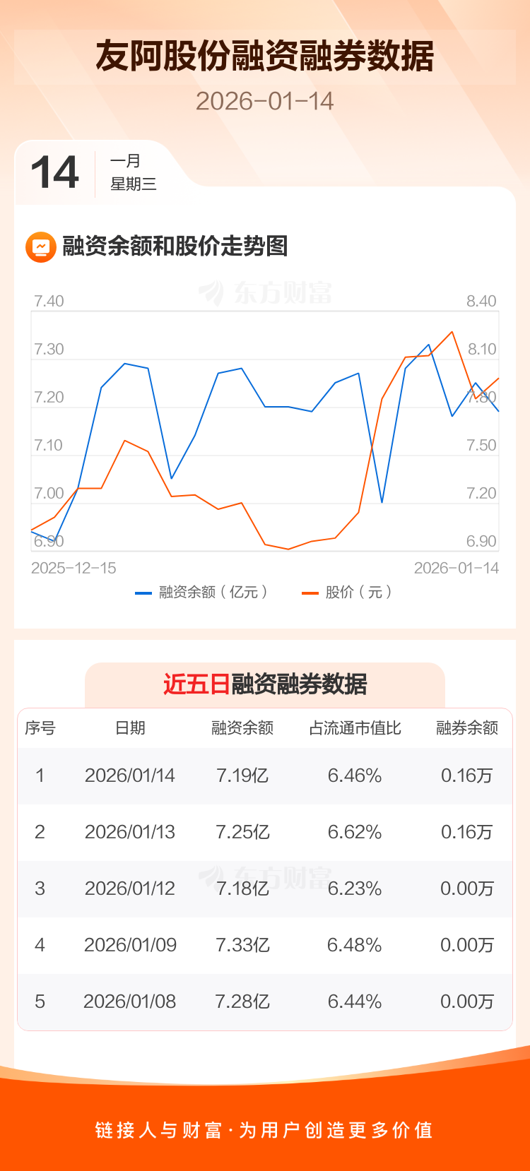 交易所最新数据显示,友阿股份于2026年1月14日获融资买入7156.77万元,融资偿还7730.83万元,当日融资净偿还574.06万元。目前,该股融资余额7.19亿,占流通市值比例为6.46%。