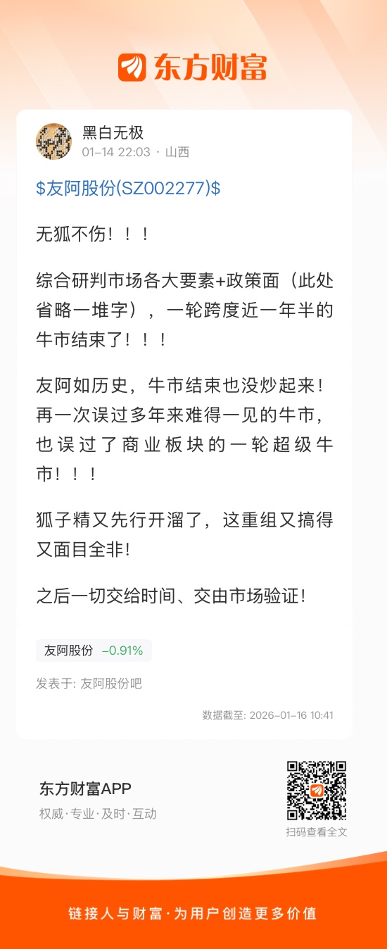 温馨提示: 1.根据《证券法》规定,禁止编造、传播虚假信息或者误导性信息,扰乱证券市场;2.用户在本社区发表的所有资料、言论等仅代表个人观点,与本网站立场无关,不对您构成任何投资建议。用户应基于自己的独立判断,自行决定证券投资并承担相应风险。《东方财富社区管理规定》