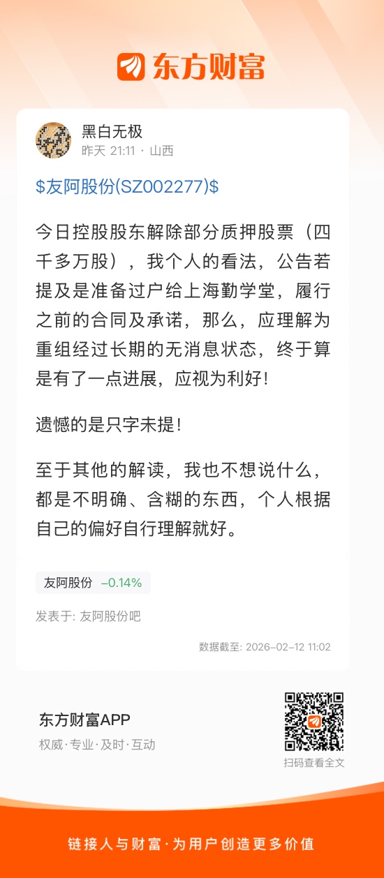 今日控股股东解除部分质押股票(四千多万股),我个人的看法,公告若提及是准备过户给上海勤学堂,履行之前的合同及承诺,那么,应理解为重组经过长期的无消息状态,终于算是有了一点进展,应视为利好!