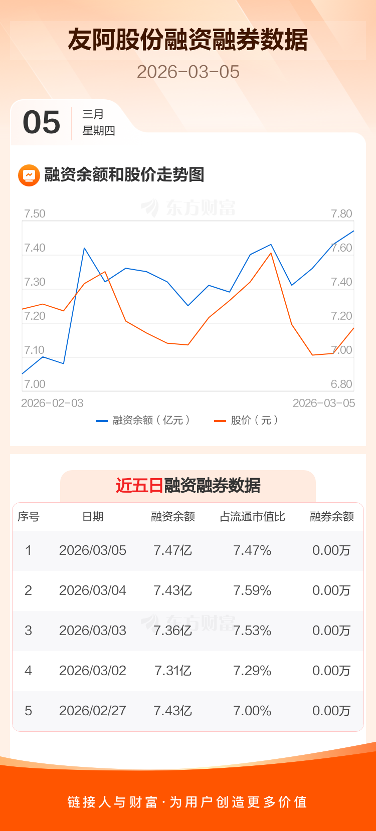 交易所最新数据显示,友阿股份于2026年3月5日获融资买入1514.99万元,融资偿还1127.85万元,当日融资净买入387.14万元。目前,该股融资余额7.47亿,占流通市值比例为7.47%。