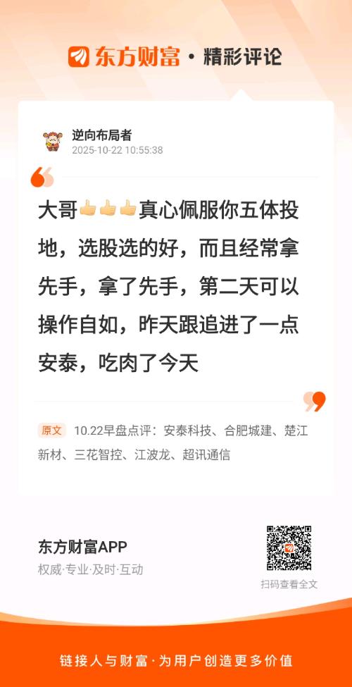 真心佩服你五体投地,选股选的好,而且经常拿先手,拿了先手,第二天可以操作自如,昨天跟追进了一点安泰,吃肉了今天