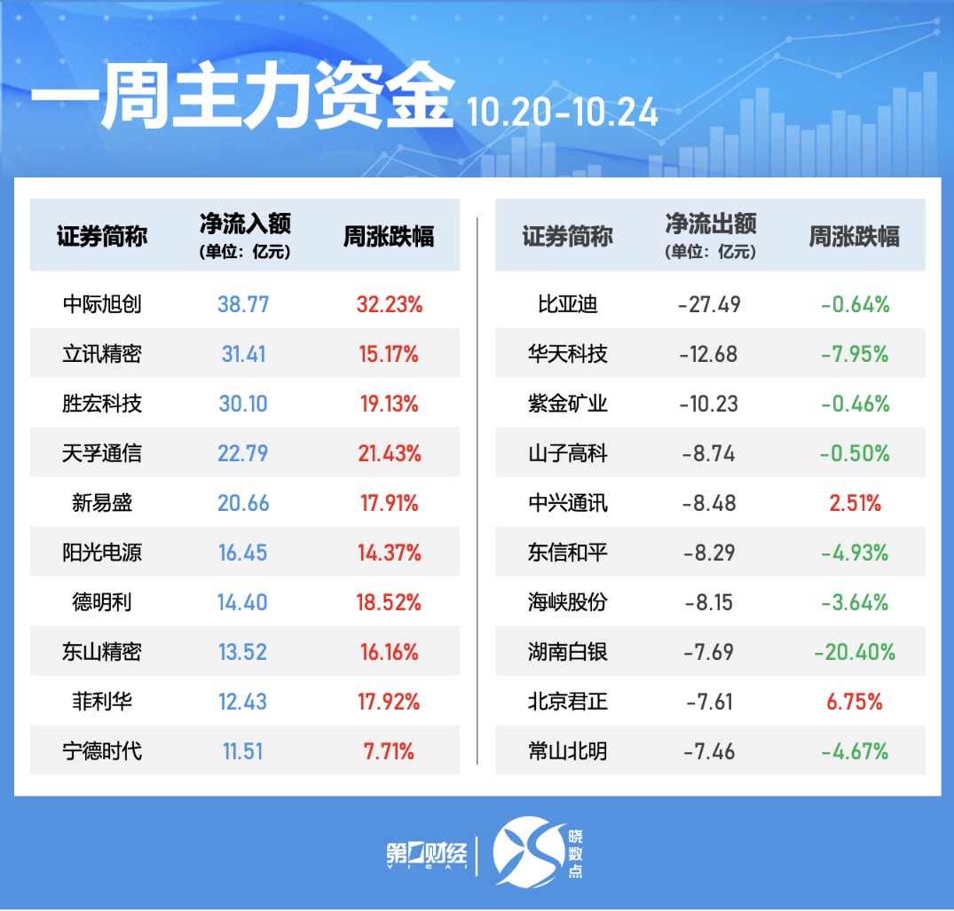个股方面,本周中际旭创、立讯精密、胜宏科技获主力净流入居前,分别为38.77亿元、31.41亿元、30.1亿元;净流出方面,比亚迪、华天科技、紫金矿业主力资金净流出额超过10亿元;其中比亚迪净流出额居首,为27.49亿元。