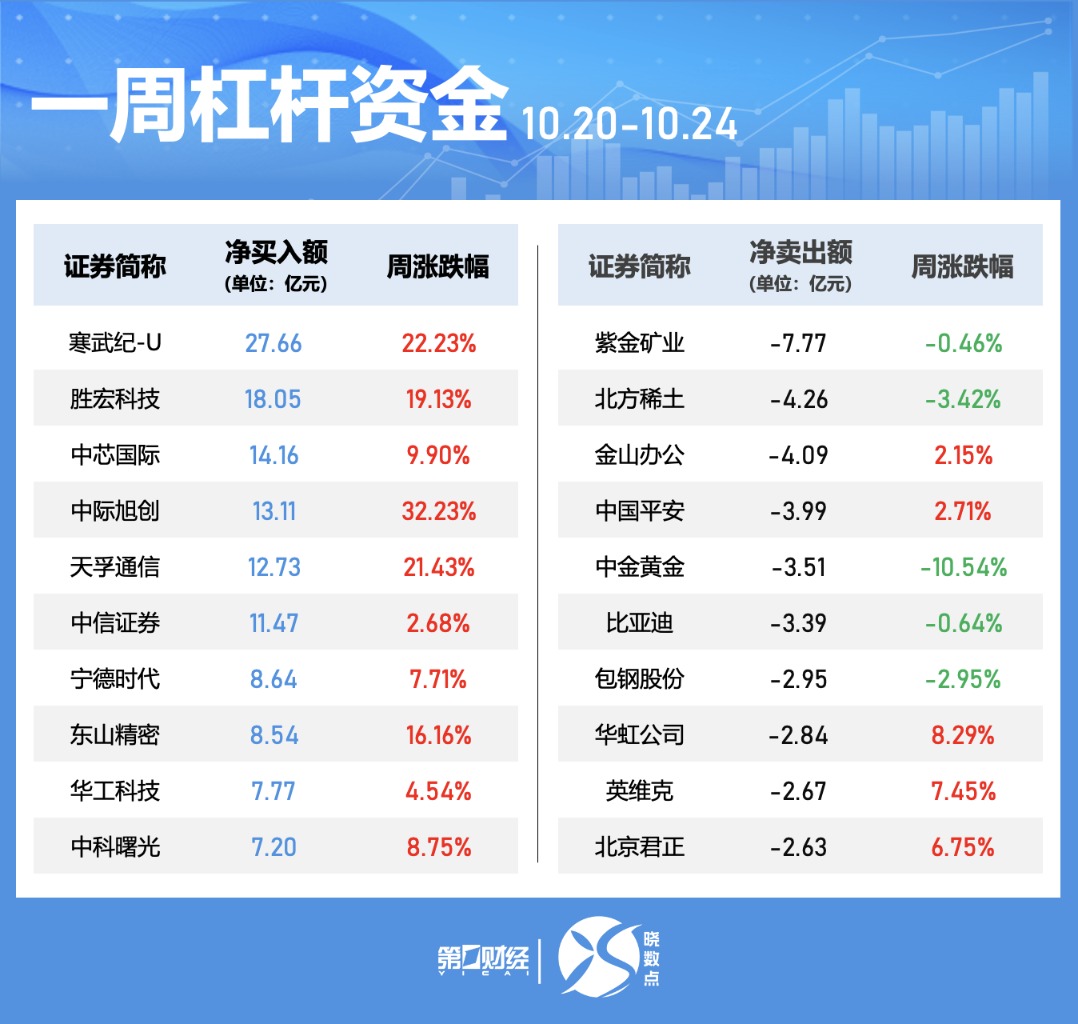 寒武纪-U本周获融资净买入居首,净买入额为27.66亿元。胜宏科技、中芯国际、中际旭创净买入额居前,金额分别为18.05亿元、14.16亿元、13.11亿元;紫金矿业、北方稀土、金山办公遭净卖出额居前,金额分别为7.77亿元、4.26亿元、4.09亿元。