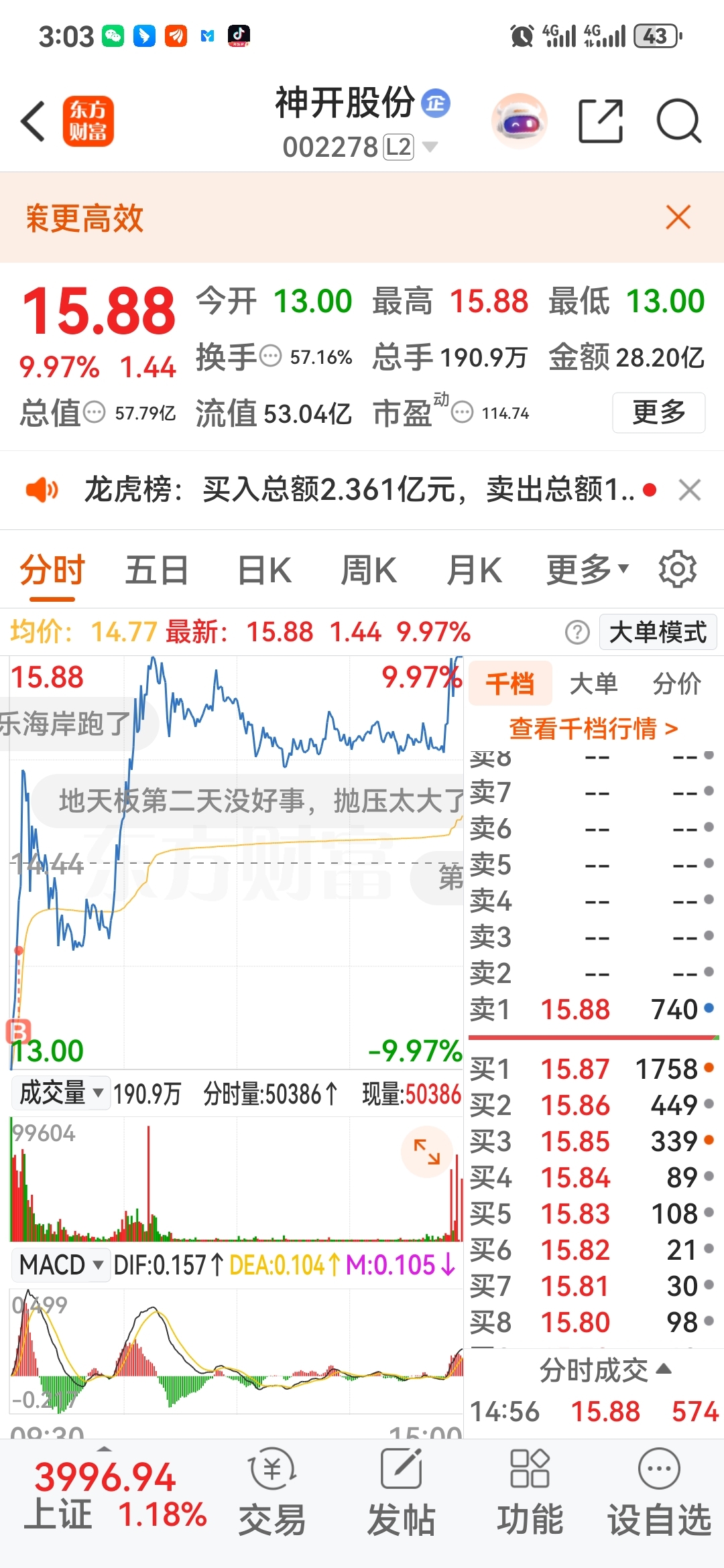 还好封住了,早盘竞价卖出鲁信投创吃三个点,神开股份十五个点,共十八个点,运气还行