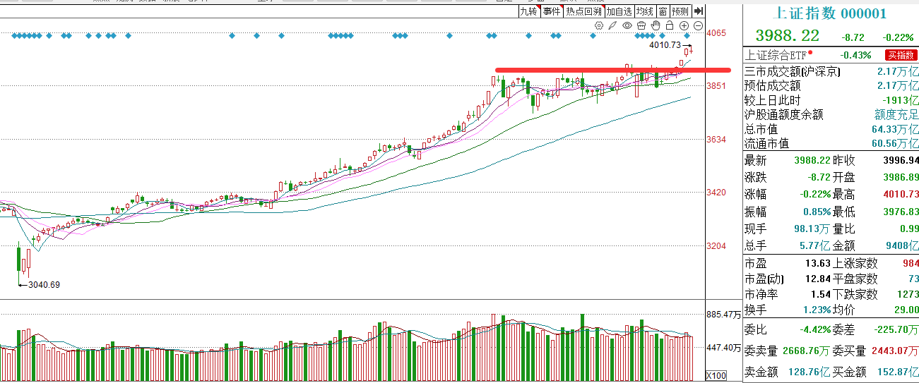 大家好我是风阶,这是今日10.29的早评。大盘离4000点近在咫尺,尽管冲高回落,但目前并没有回调的迹象。短线应该能很快突破4000点,指数不在在于小震荡。尽管昨天指数走的比较弱,但盘面还是比较活跃的,上涨个股依然达到半数以上。创业板指刚好在前高附近,这个位置还面临回调压力。后期行情主打还是个股,指数已经不是特别重要了。分化行情还是主旋律,如果选不好板块及个股,大盘突破四千也还是被困的。