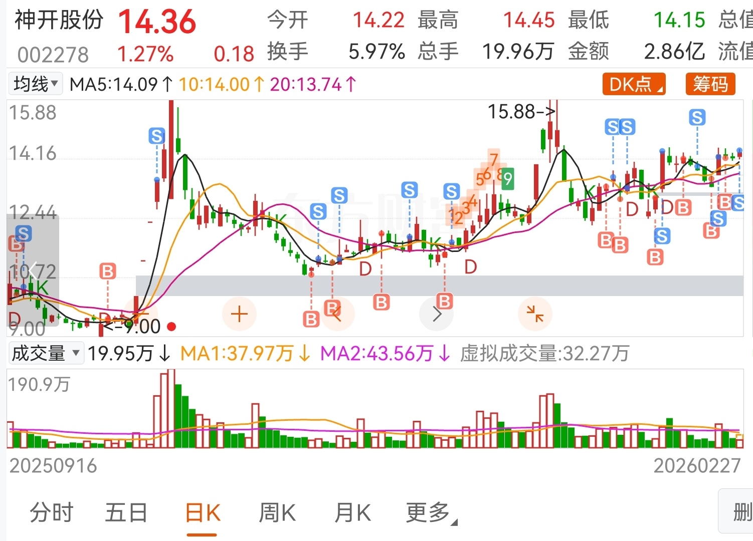 $神开股份(SZ002278)$ 本人不会炒股,而且胆子小,有点盈利就跑了,买卖点经常错误!勿喷!