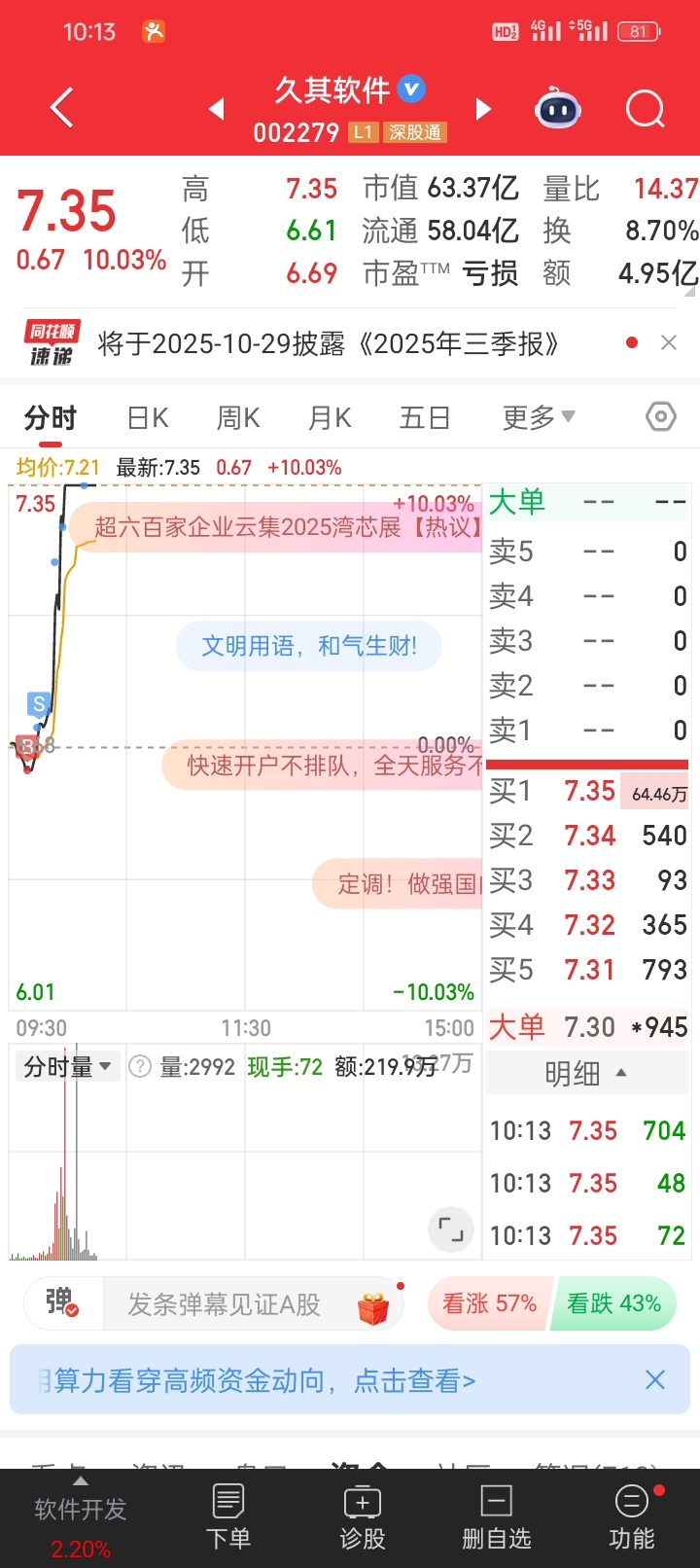 $久其软件(SZ002279)$ 涨停卖了三分之一,今天封住没问题,明天在涨停剩下的全部给你!!