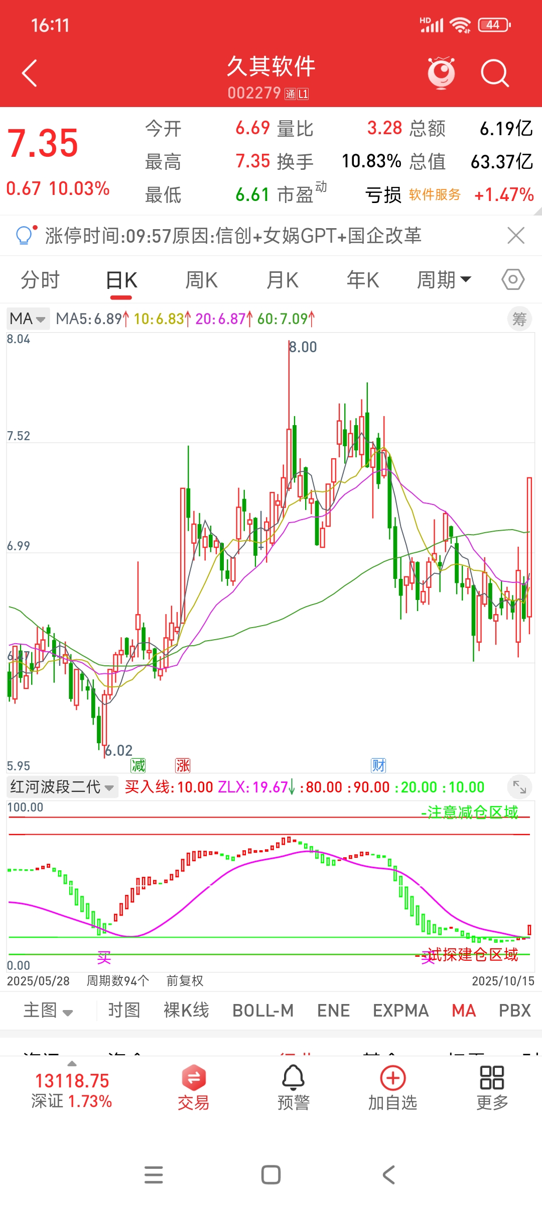 $久其软件(SZ002279)$ 底部出现买字以后,绿柱转红柱确认,今天上行也正常,毕竟红柱不停,上涨不止,红柱拉长,加速不止,继续