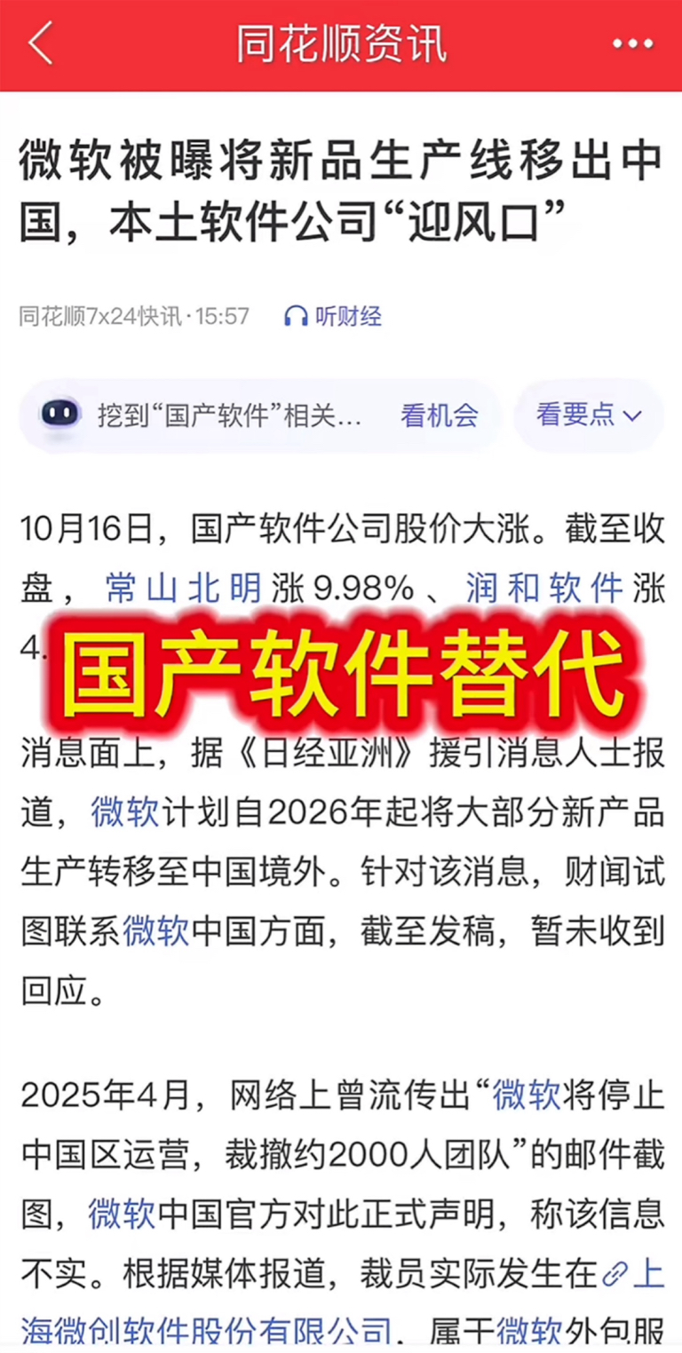 下午传出一条小道消息,微软官宣要把新产品生产挪到境外,这一消息直接利好国产软件替