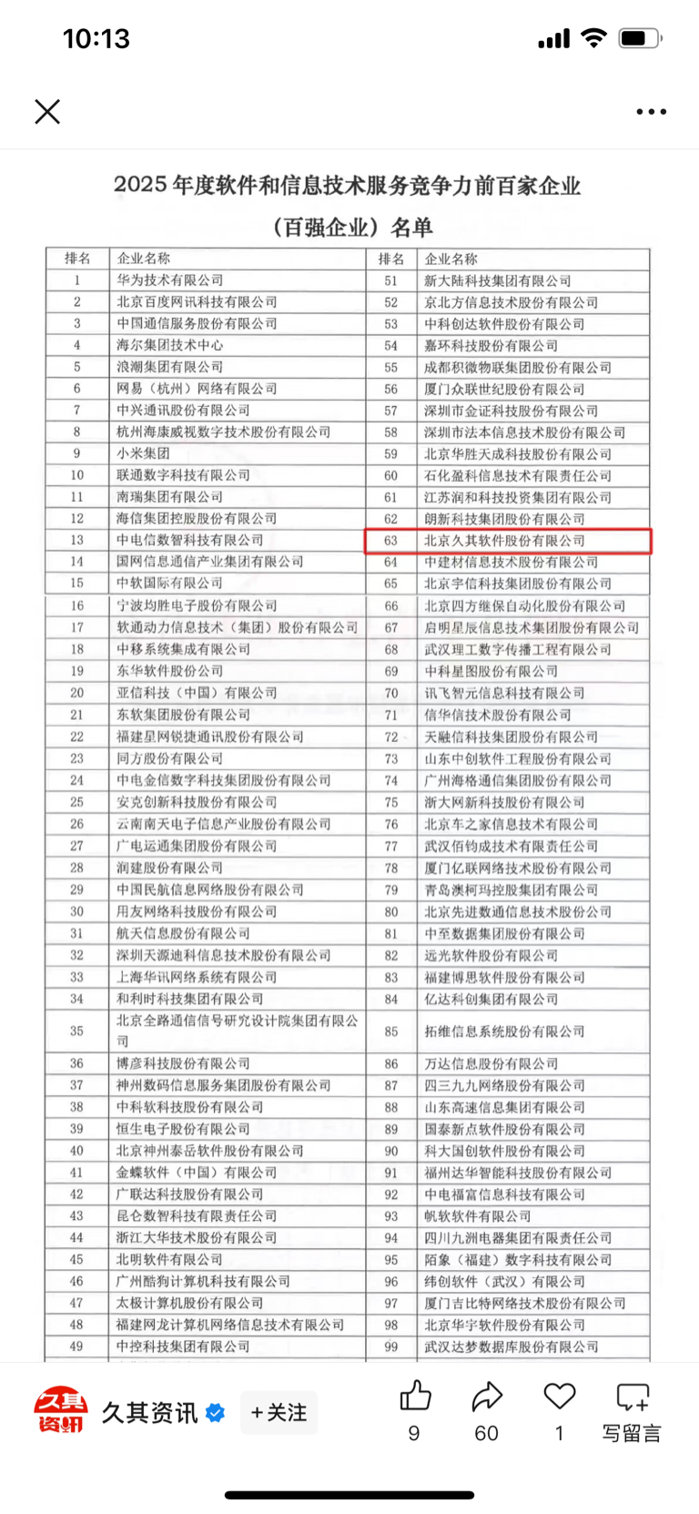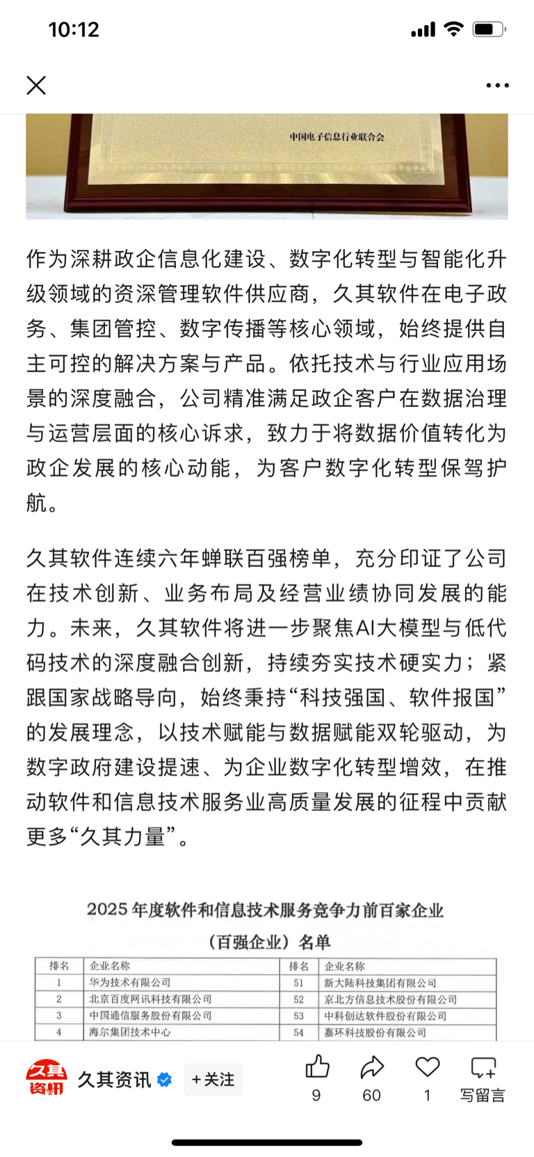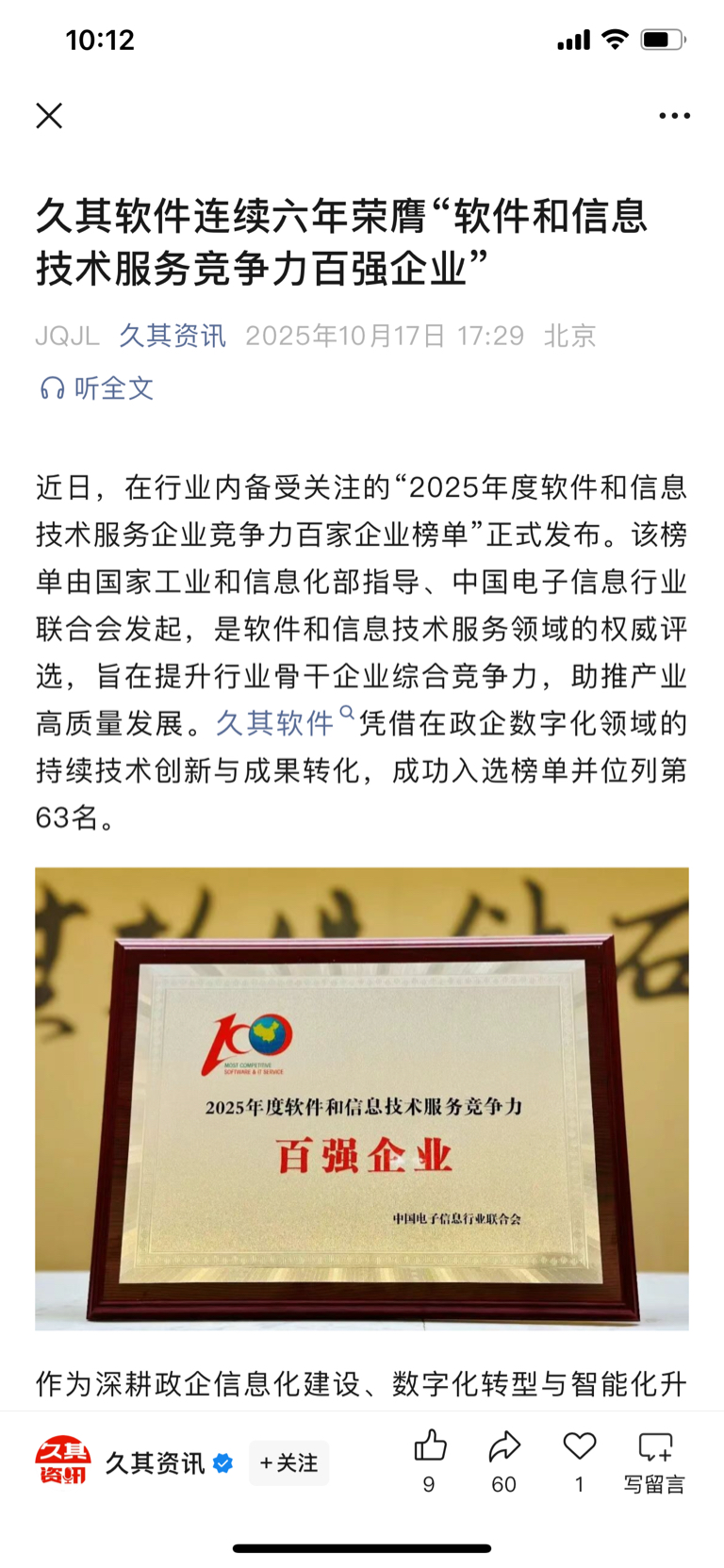 久其软件连续六年荣膺“软件和信息技术服务竞争力百强企业”