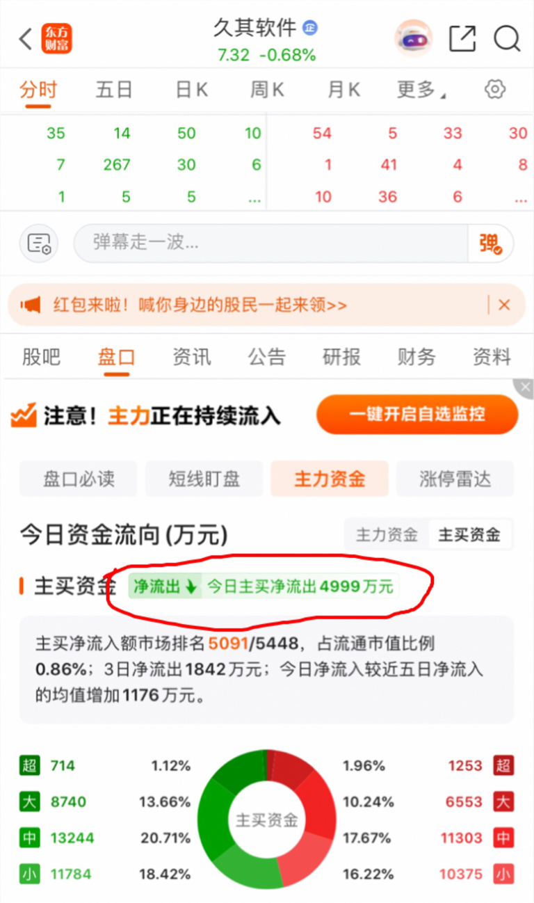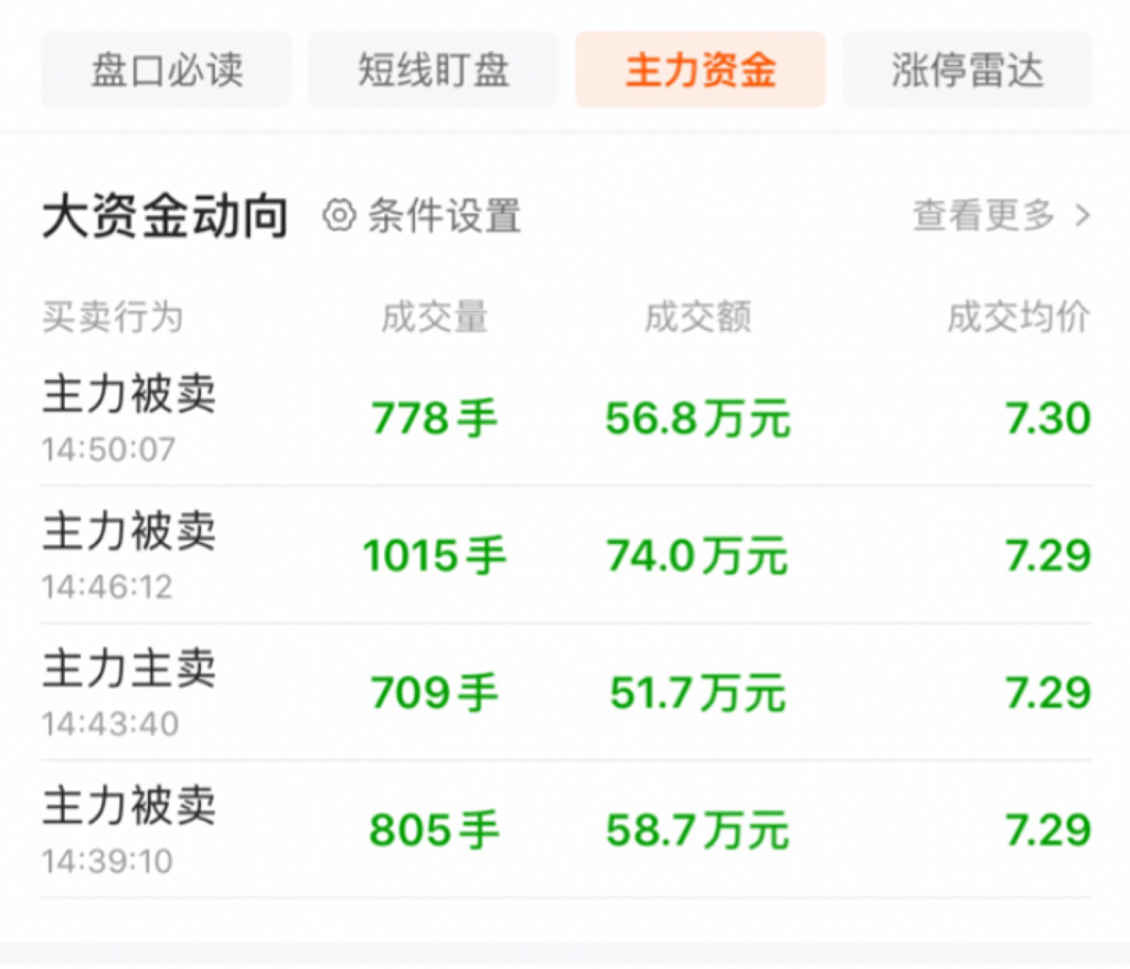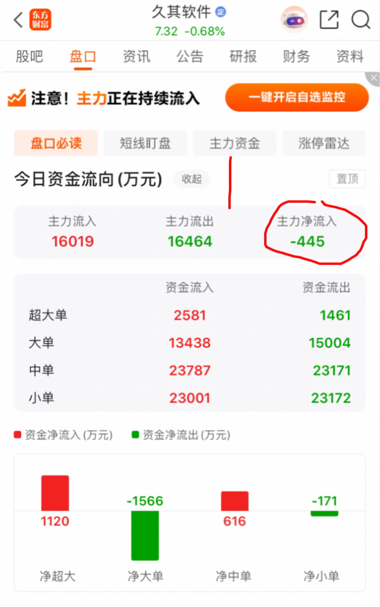 表面1显示主力跑了四百多万,实际主力跑了近五千万,再看看全体分时图绿柱明显比红主