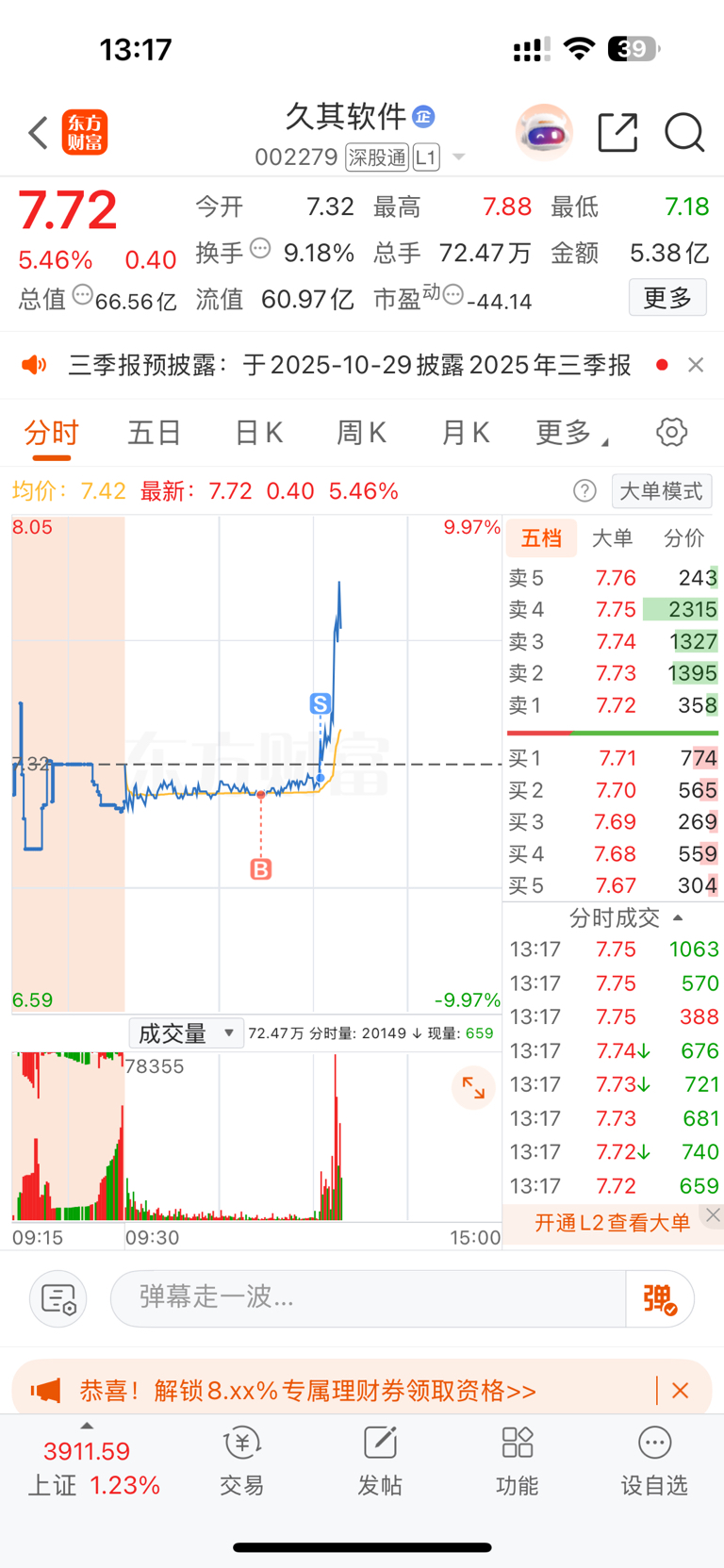 $久其软件(SZ002279)$ 亏了几千块,刚卖完就拉。