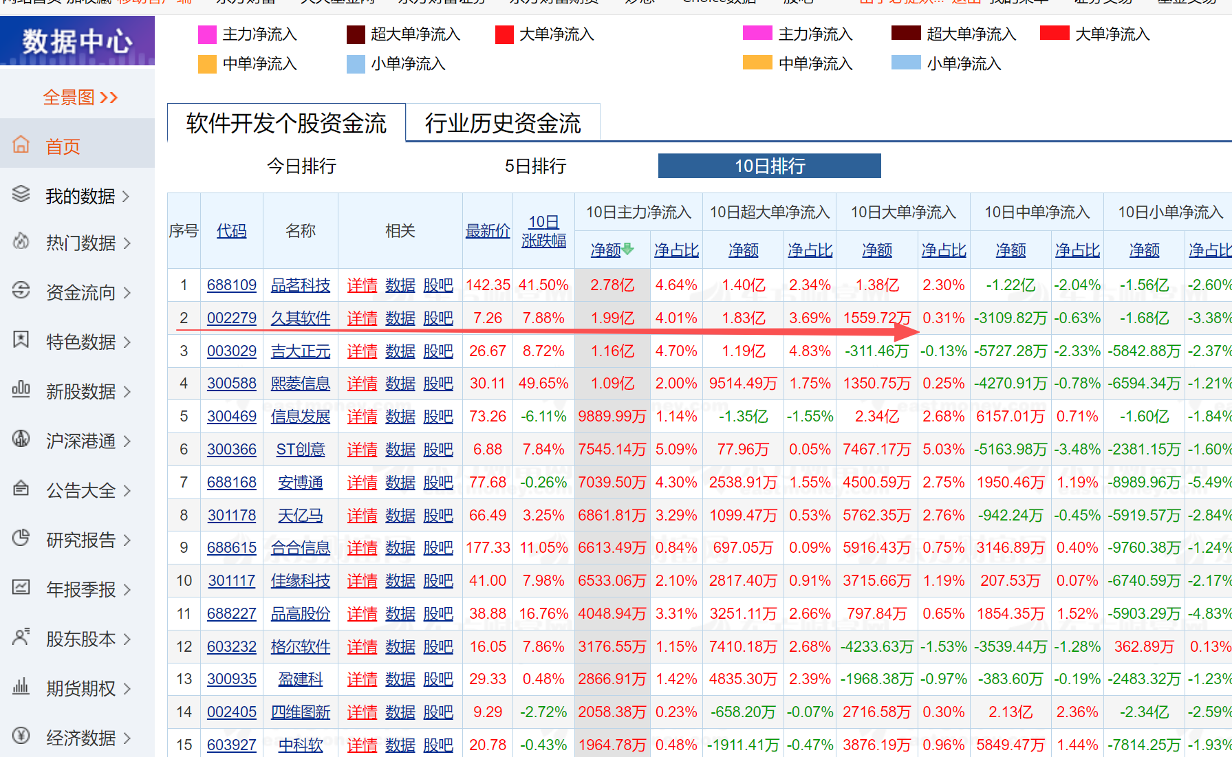 整个软件板块。久其软件10个交易日资金流入第二名、市值也不大。价格还最低、人气也