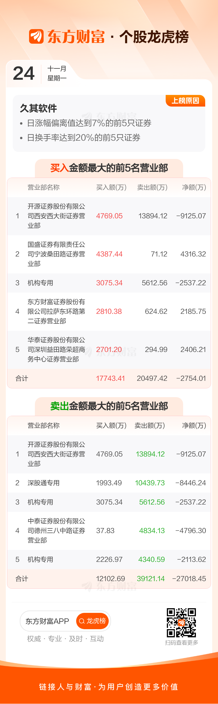 交易所2025年11月24日公布的交易公开信息显示,久其软件因成为日涨幅偏离值达到7%的前5只证券、日换手率达到20%的前5只证券、连续三个交易日内,涨幅偏离值累计达到20%的证券上榜。久其软件当日收报9.83元,涨跌幅9.96%,偏离值9.13%,换手率38.02%,成交额28.38亿。异常期间11月21日至11月24日,期间涨幅20.91%,累计偏离值23.50%,区间成交额39.99亿。