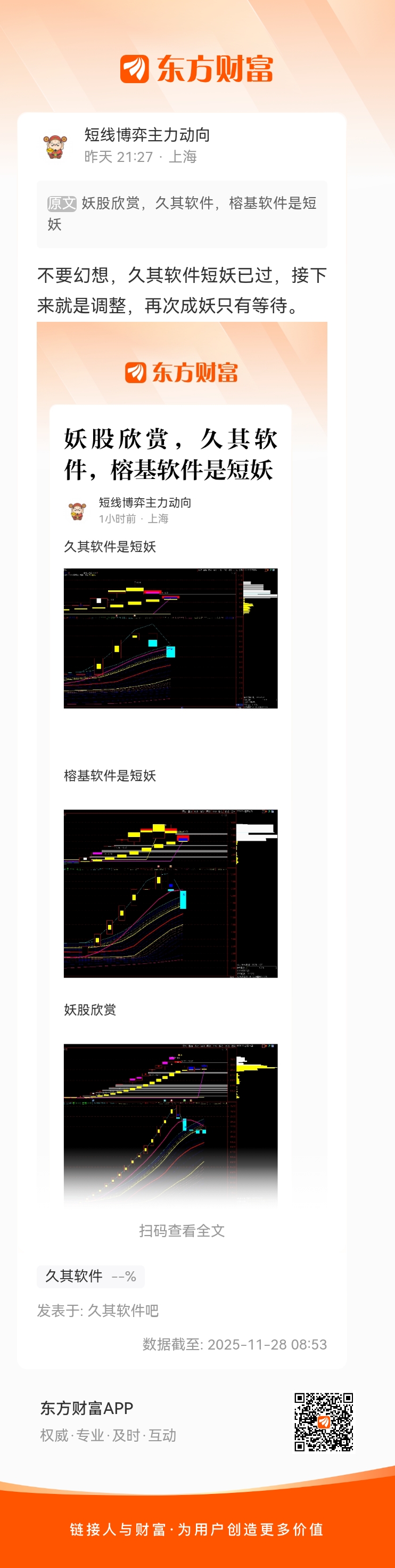 久其软件成不了大妖,大妖主力筹码多,拉升不给游资机会,短妖主力筹码少,必须借助于游资炒作。//@短线博弈主力动向 :不要幻想,久其软件短妖已过,接下来就是调整,再次成妖只有等待。