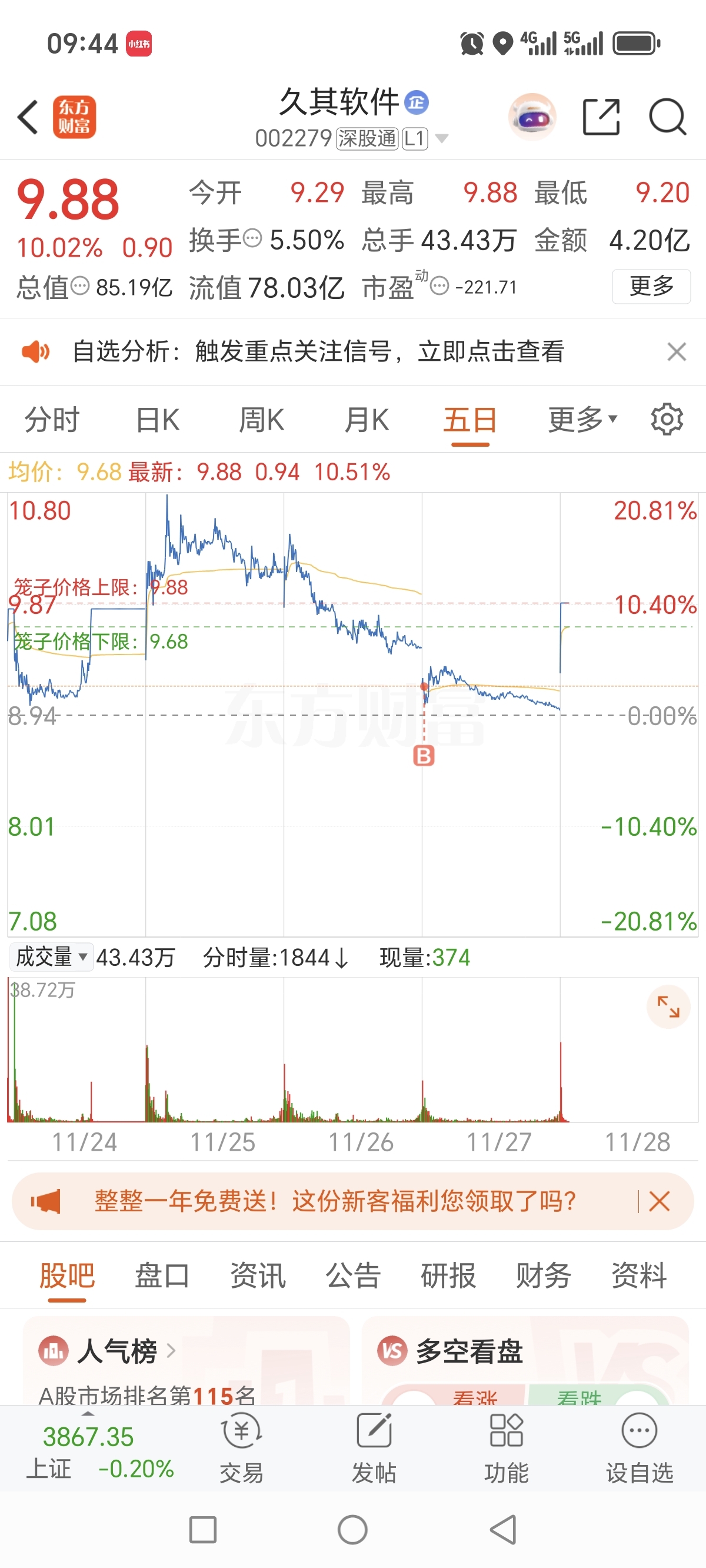 $久其软件(SZ002279)$ 昨天卖浪潮买久其,只为验证模式
