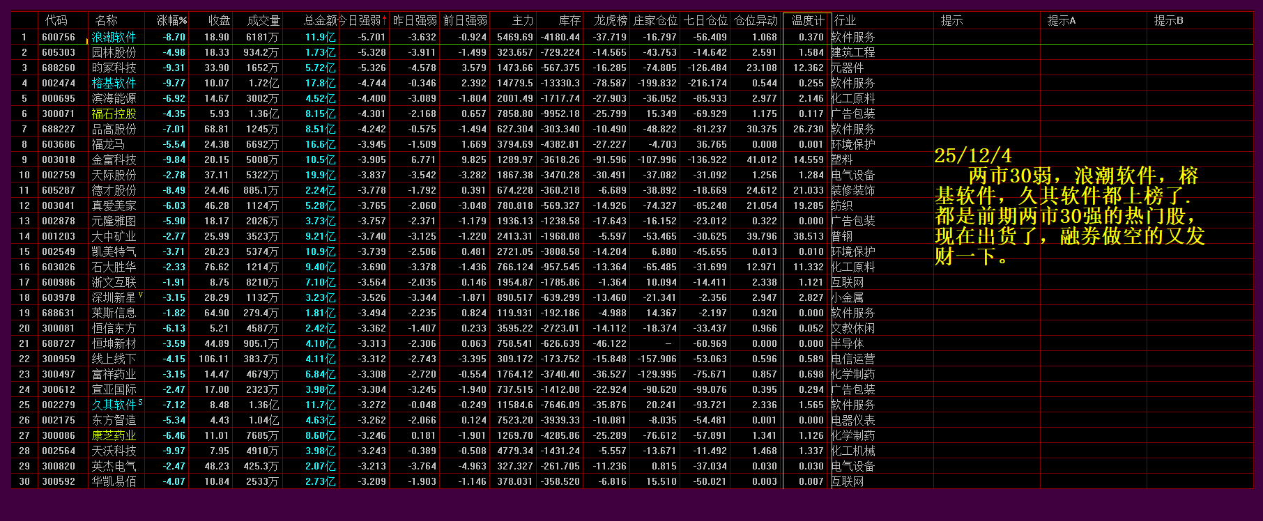 两市30弱,上榜股票都是有庄家派发筹码,融券做空行为造成的