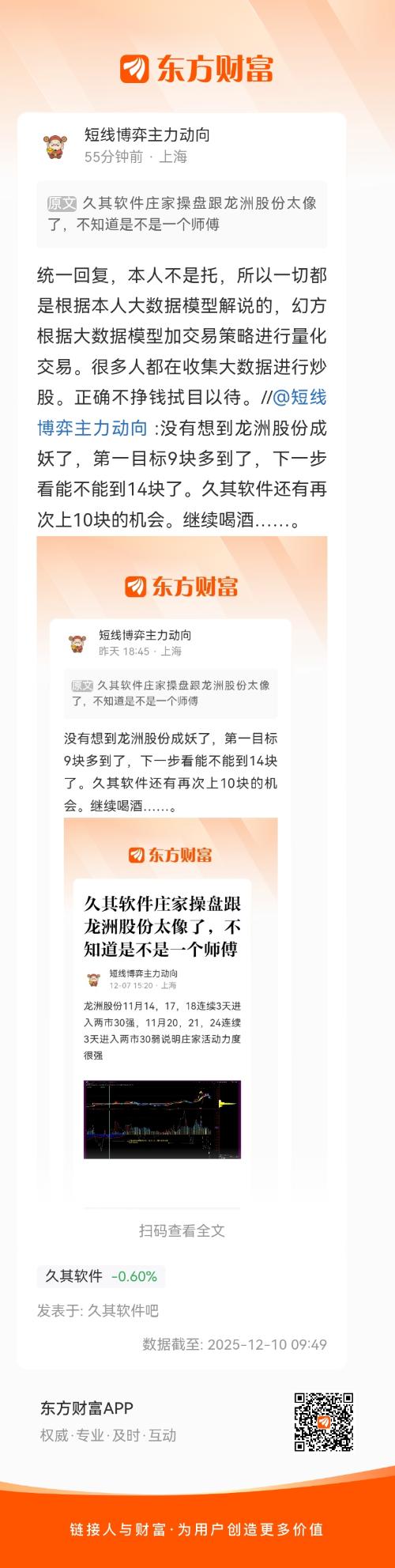 龙洲股份今天见好就收,落袋为安,出来资金也可以玩玩久其软件。//@短线博弈主力动向 :统一回复,本人不是托,所以一切都是根据本人大数据模型解说的,幻方根据大数据模型加交易策略进行量化交易。很多人都在收集大数据进行炒股。正确不挣钱拭目以待。//@短线博弈主力动向 :没有想到龙洲股份成妖了,第一目标9块多到了,下一步看能不能到14块了。久其软件还有再次上10块的机会。继续喝酒……。