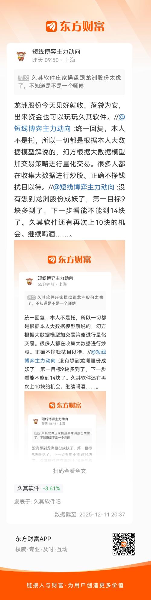 龙洲股份见顶卖出是高手,九七7块水下游。10.80换手率41.2%,水下必须换手率80%//@短线博弈主力动向 :龙洲股份今天见好就收,落袋为安,出来资金也可以玩玩久其软件。//@短线博弈主力动向 :统一回复,本人不是托,所以一切都是根据本人大数据模型解说的,幻方根据大数据模型加交易策略进行量化交易。很多人都在收集大数据进行炒股。正确不挣钱拭目以待。//@短线博弈主力动向 :没有想到龙洲股份成妖了,第一目标9块多到了,下一步看能不能到14块了。久其软件还有再次上10块的机会。继续喝酒……。